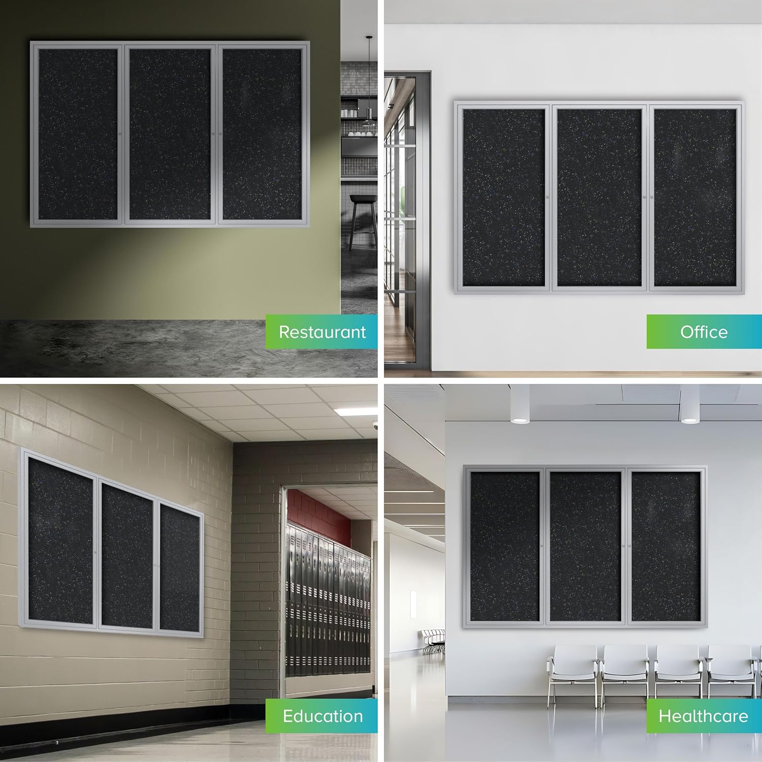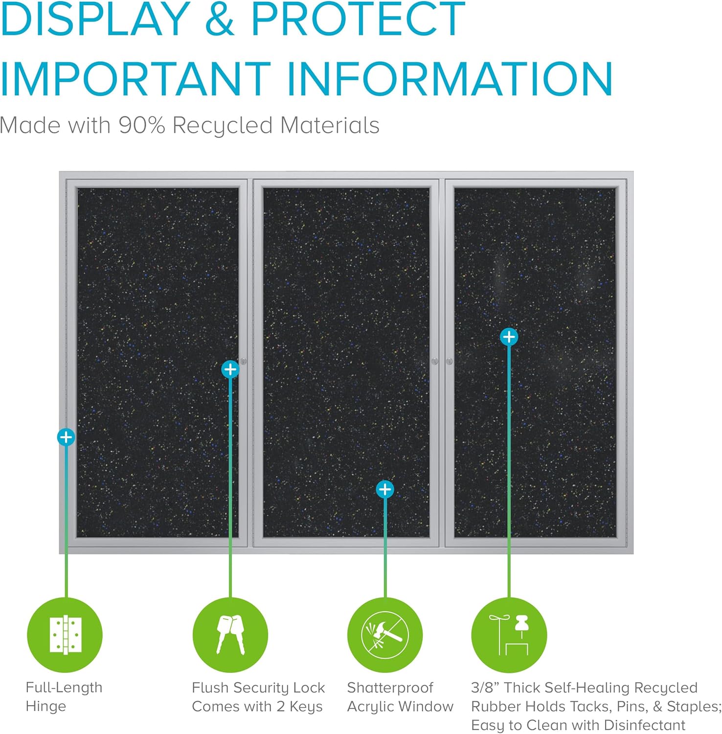 Ghent 48" x 96" 3-Door indoor Enclosed Recycled Rubber Bulletin Board, Shatter Resistant, with Lock, Satin Aluminum Frame,Confetti (PA34896TR-CF)-Made in USA