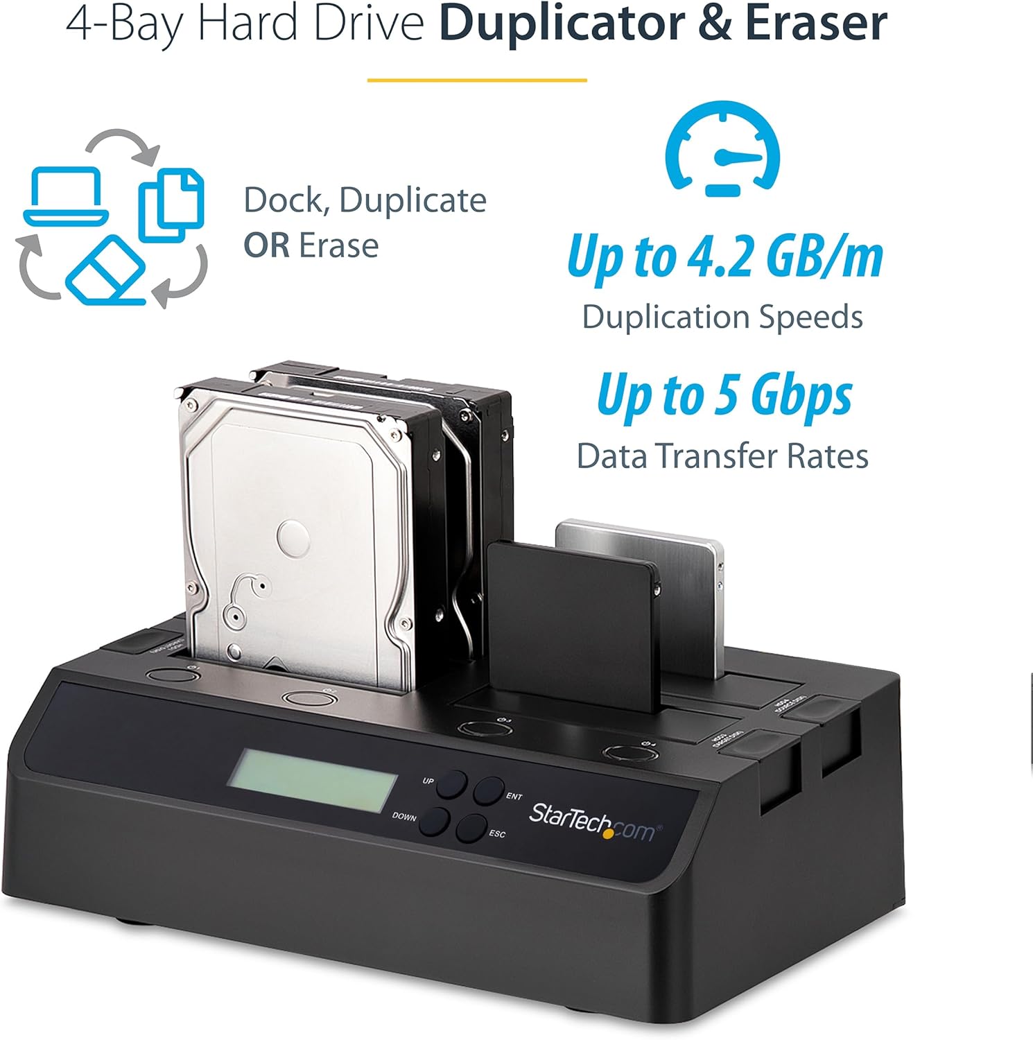 - DUPLICATE, ERASE AND DOCK: This 4-bay external cloner and drive eraser/ wiper performs standalone cloning or erasing of 2.5/3.5" SATA drives; Hard disk docking station for quick access to your 2.5/3.5" SATA drives over USB or eSATA