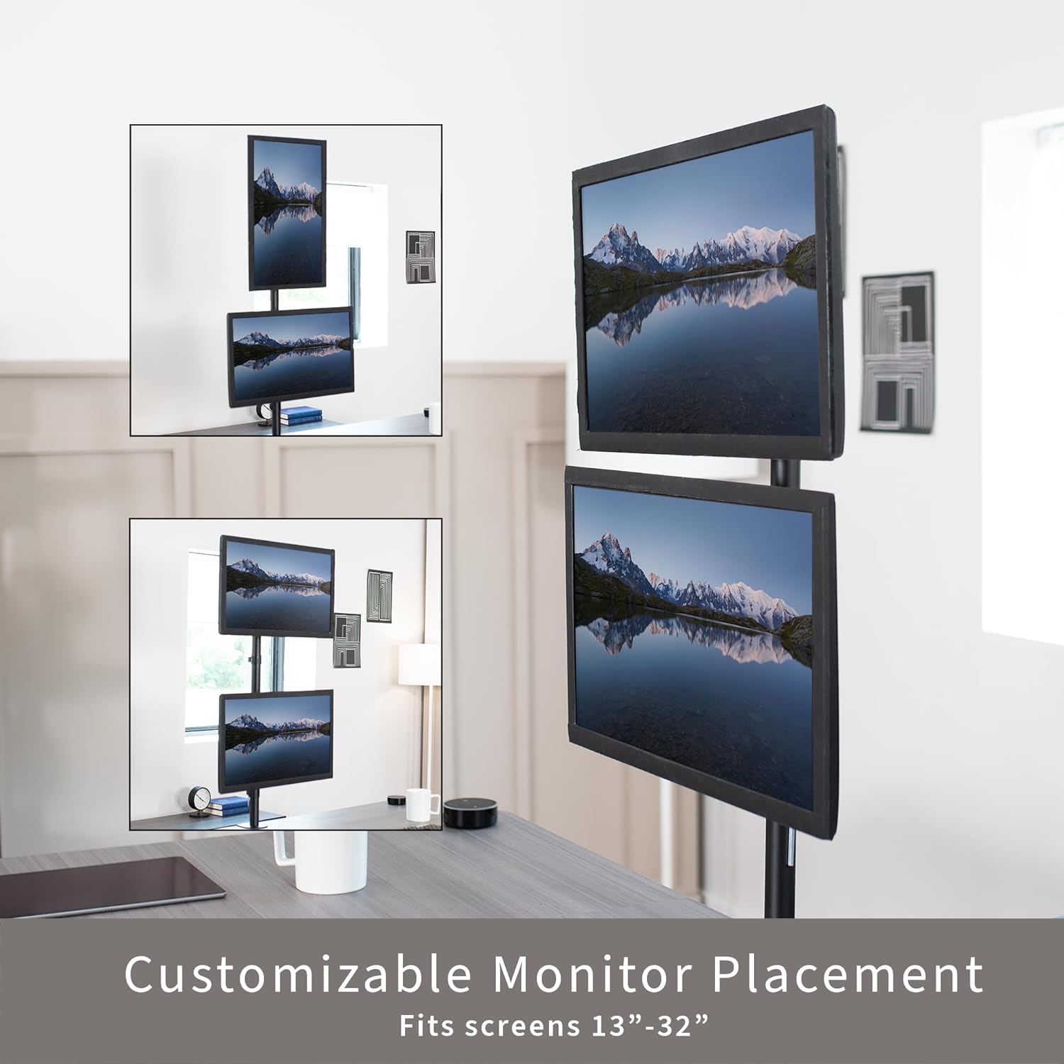 - Articulation and Height Adjustment: Adjustable mount offering +15° to -15° tilt, 360° swivel, 360° rotation, and height adjustment along the center pole for optimal viewing angles. Monitors can be placed in portrait or landscape orientation