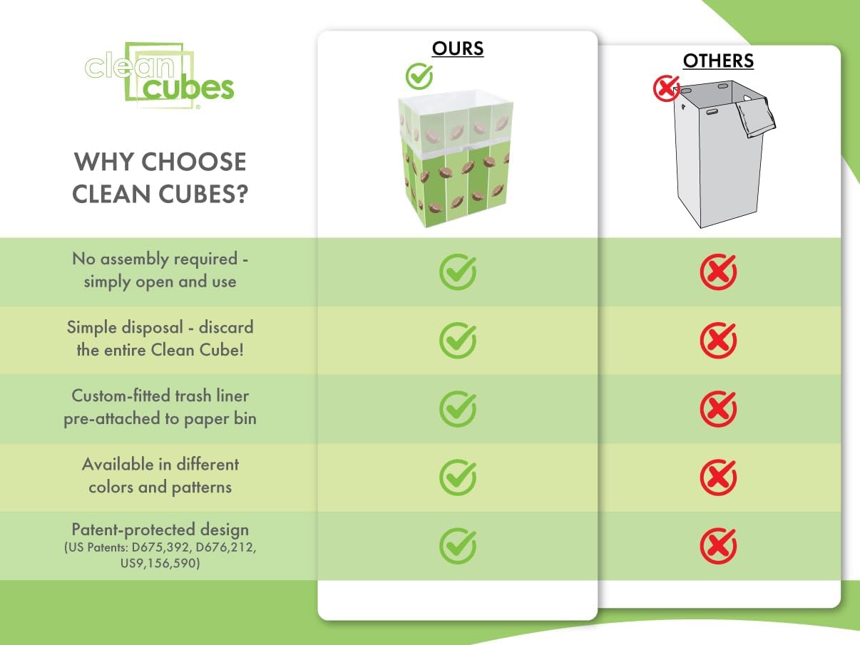 - â ăEFFORTLESS CLEANUP & DISPOSALăSimply unfold, use, and toss â keep your event clean and mess-free without extra effort. Clean Cubes are disposable recycling bins and trash cans with a patent-protected design and custom-fitted trash liner in each bin.