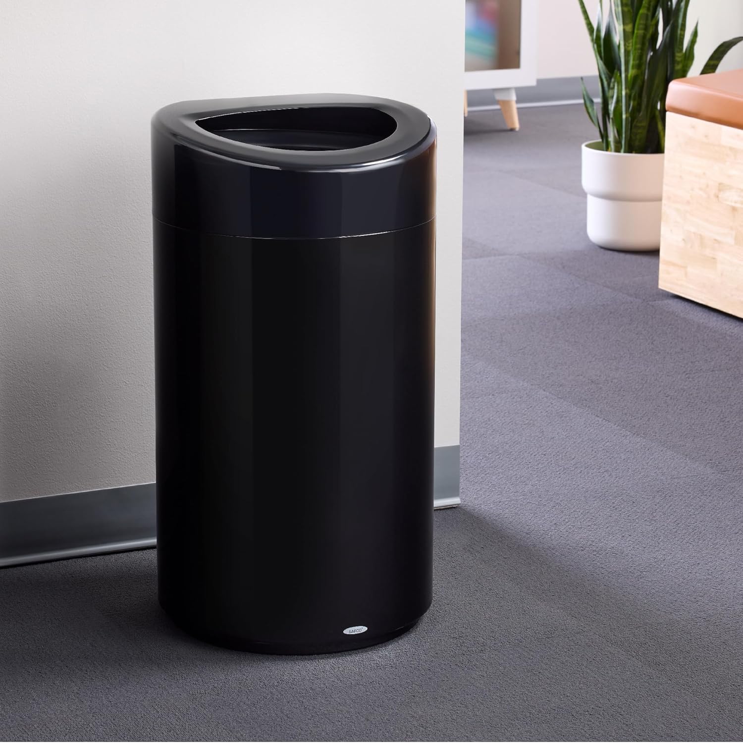 - MODERN STYLING. Safco Open Top Trash Receptacle with Liner combines contemporary styling with hands-free disposal to create a high capacity trash can ideal for offices, lobbies, reception areas and entryways.
