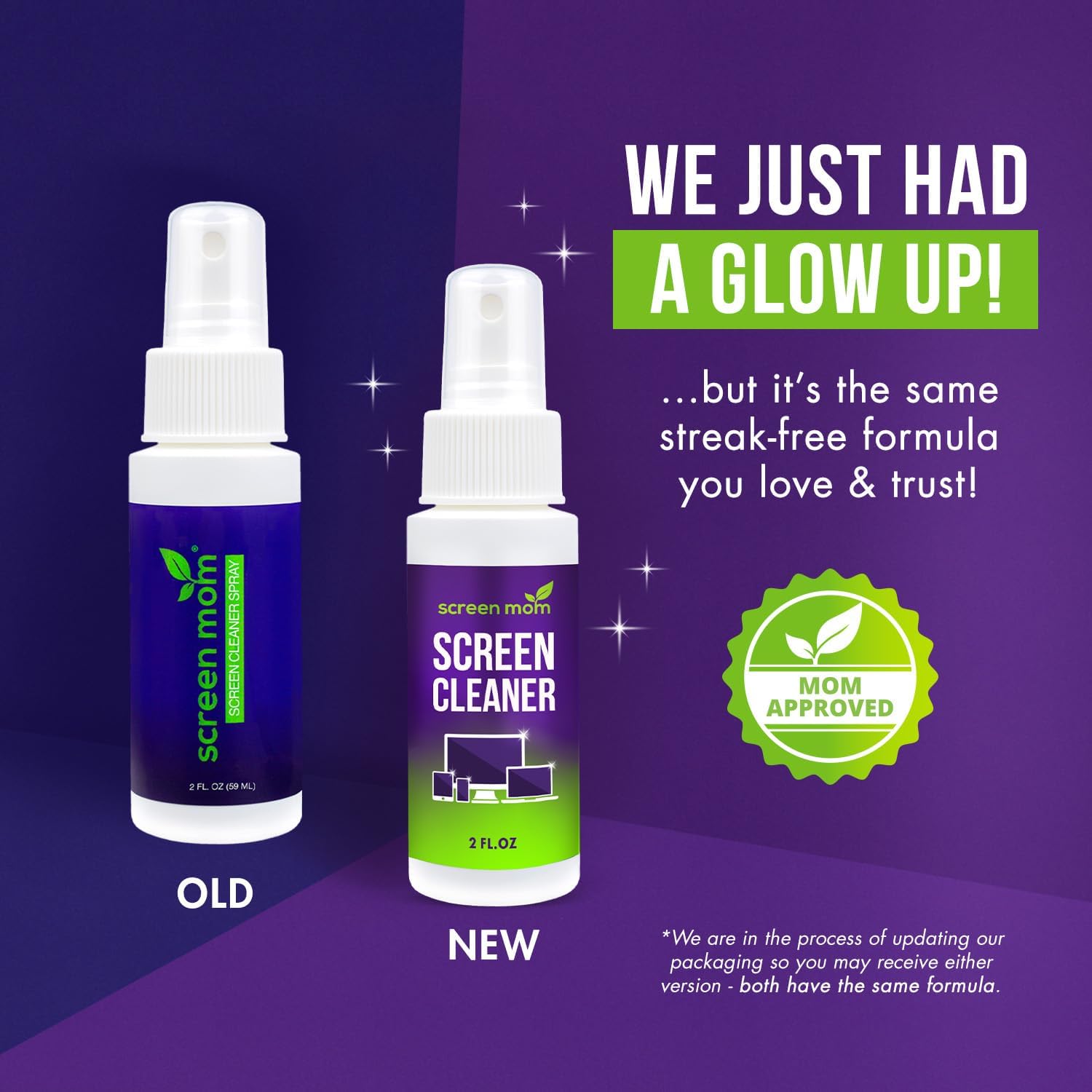 Screen Cleaner Spray and 2 Microfiber Cloths - 2oz Bottle by Screen Mom-Screen Cleaner Spray and Wipe for TV, Computer, Phone, iPad, Car Screen Cleaning Kit Electronic Cleaner Spray