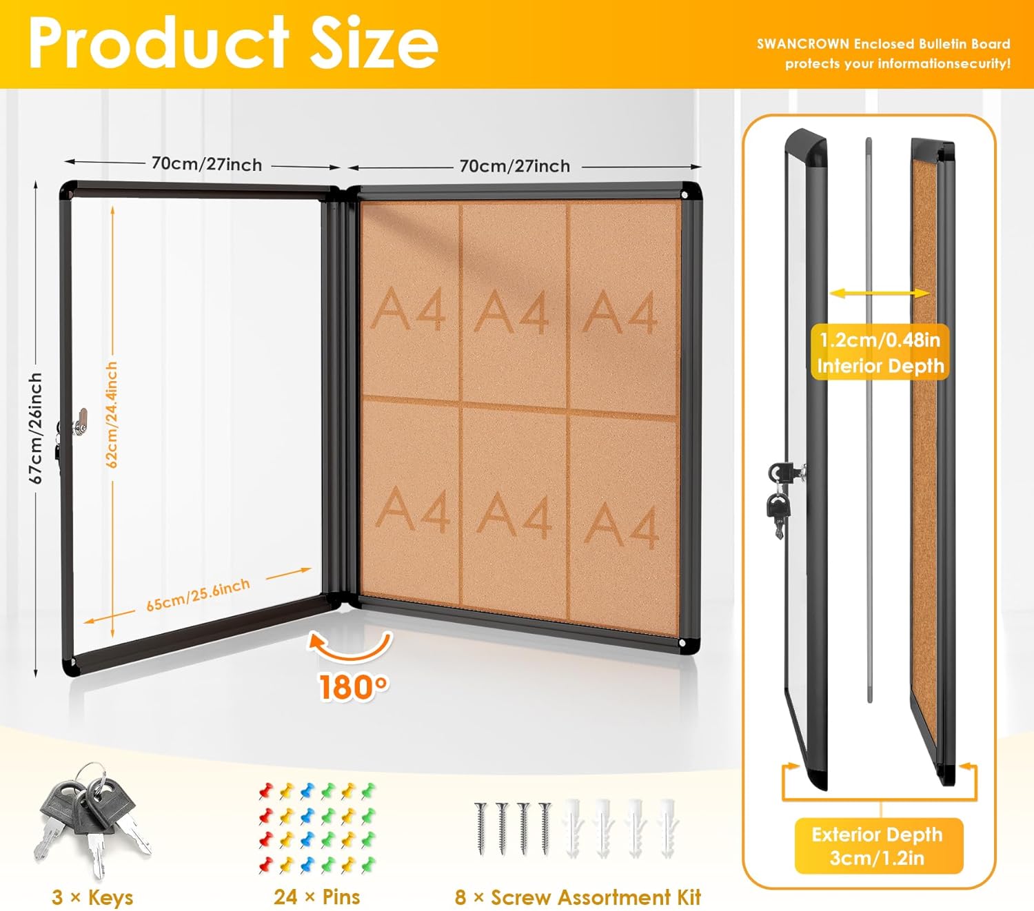SWANCROWN Lockable Noticeboard Wall-Mounted Bulletin Cork Boards Tamper Proof Information Board Indoor,Black Frame,28x26 inch (6xA4)