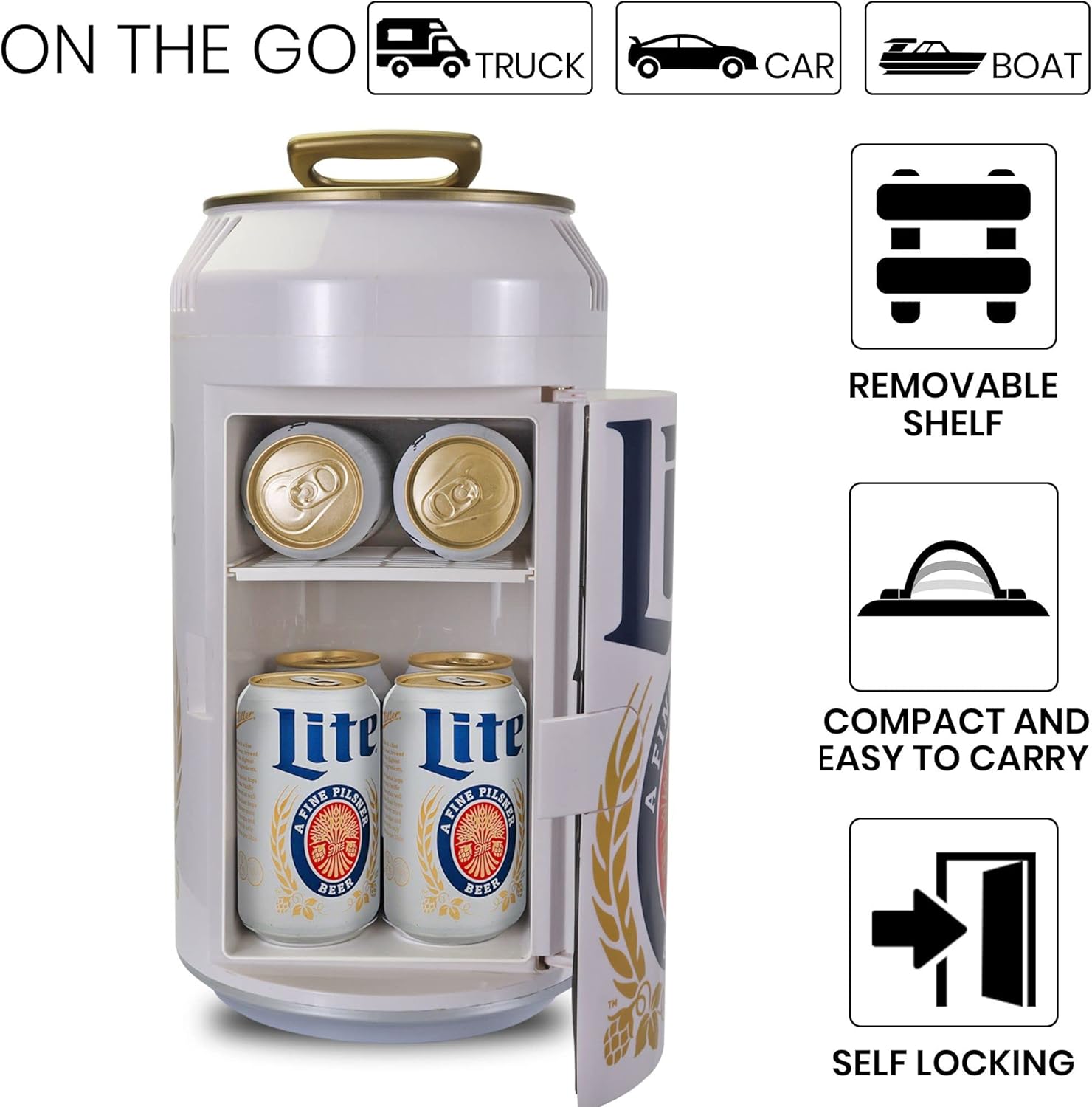 - SLEEK MILLER LITE DESIGN: Enjoy your favorite brew with this stylish white and gold mini fridge, designed to resemble a giant can of Miller Lite. Featuring licensed graphics and a convenient pull-tab carry handle, it’s a must-have for beer enthusiasts and collectors alike, adding an attractive and fun element to any space.