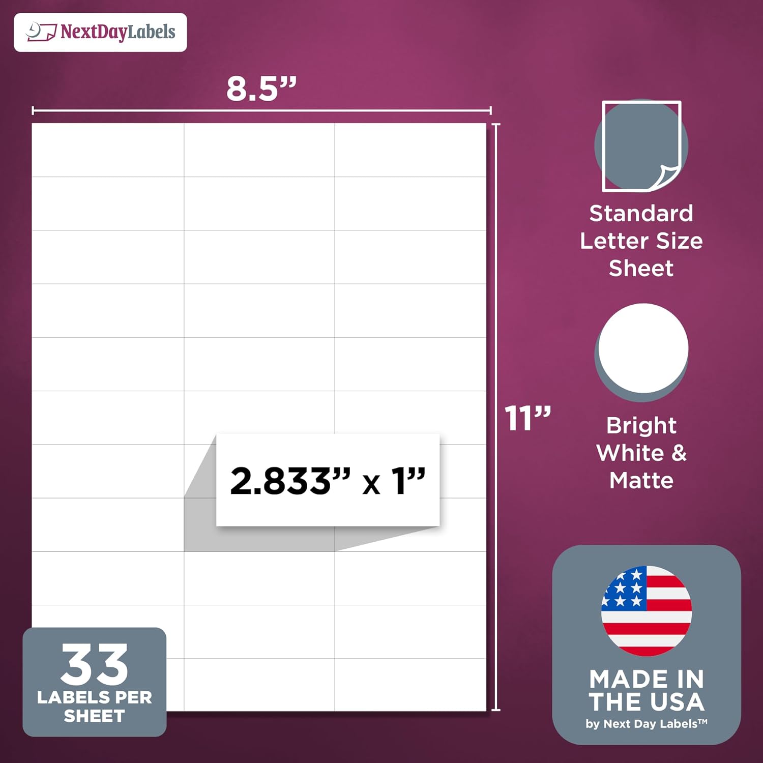 NextDayLabels - 2.83" x 1" Rectangular Sticker Labels for Printer - White Laser/Inkjet Printer Labels Return Address Labels Shipping Label Stickers (100 Sheets, 33 Per Sheet, 3300 Labels)