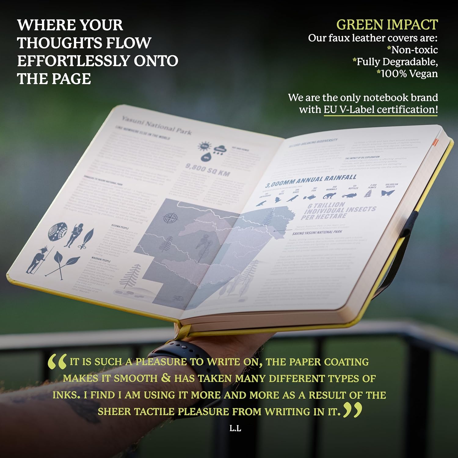 - A5 NOTEBOOK WITH LOTS O' FEATURES: Dingbats notebooks ooze quality - this hardcover bound leather notebook is crafted with PU vegan leather, micro-perforated cream 100gsm pages, an elastic closure and pen holder. It's complete with a silhouette of the Yasuni, an infographic spread about the endangered region in the endsheets and an inner pocket for a little added detail - the perfect gifts for men and women, these travel essentials are a gift that keep on giving