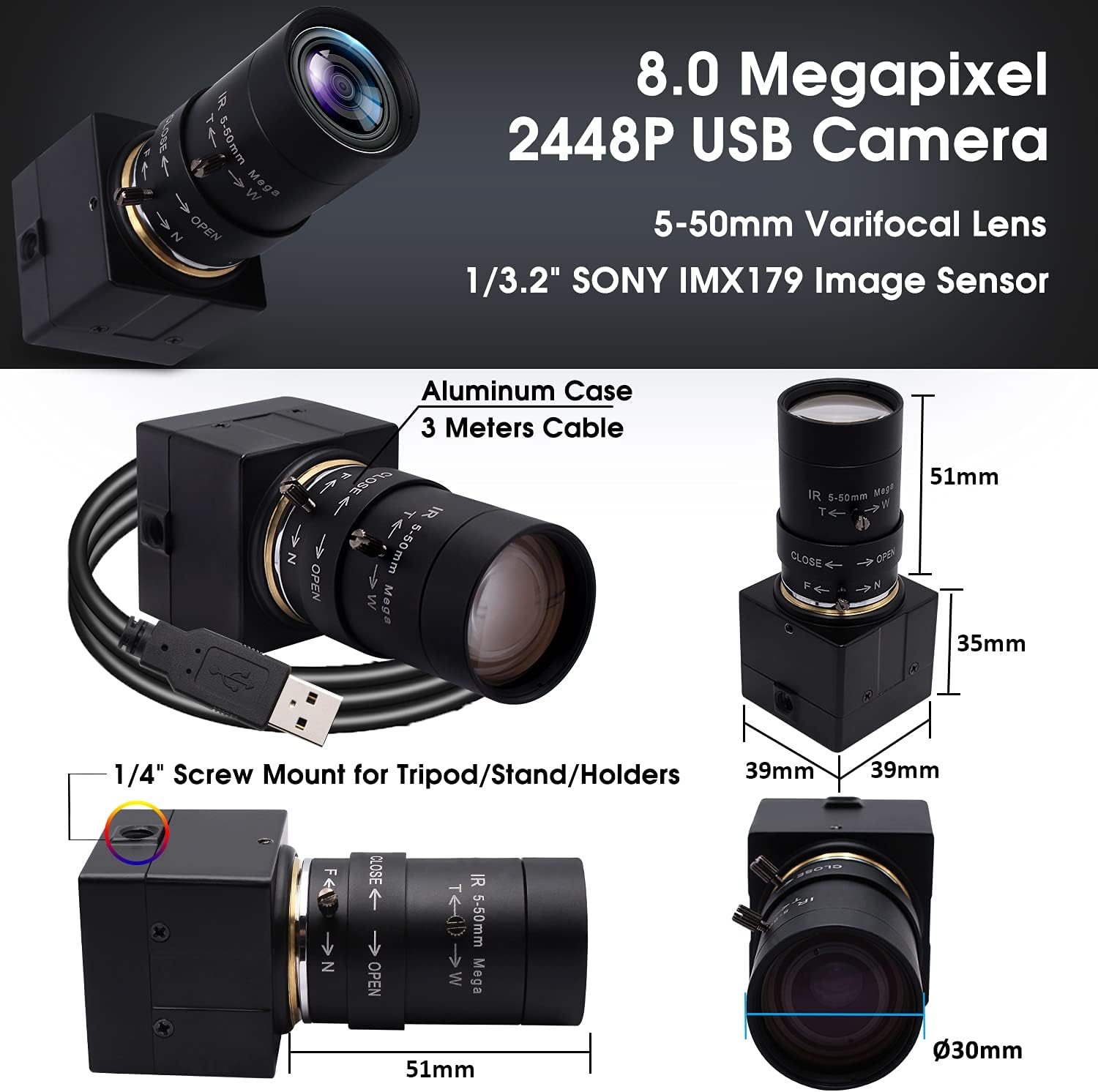 - 【Advanced SONY IMX179 Sensor】 8MP high definition industrial camera USB with 1/3.2" Sony IMX179 Sensor for decent image and accurate color reproduction.This camera can meet most clarity requirements for different applications. Solid build metal case with a standard 1/4" screw hole at the top and bottom of the camera for tripod mount or regular webcam stand and holders