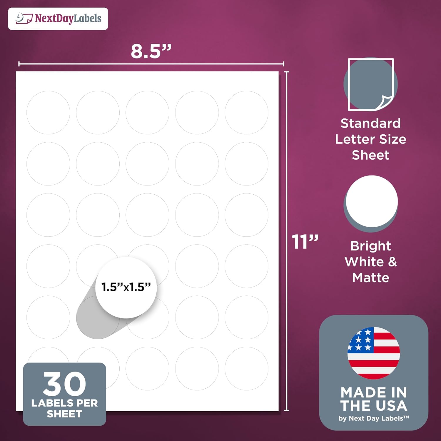 NextDayLabels 1.5 Inch Round Matte White Blank Labels - Circle Stickers for Laser/Inkjet Printers (3000 Labels, 100 Sheets of 30)