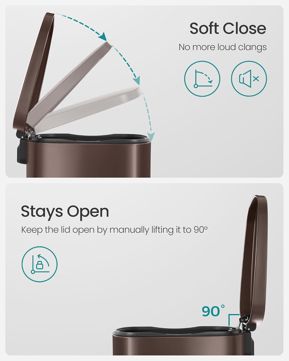 - [Soft Closure] The lid of the garbage can closes slowly, softly, and silently without making a loud clang