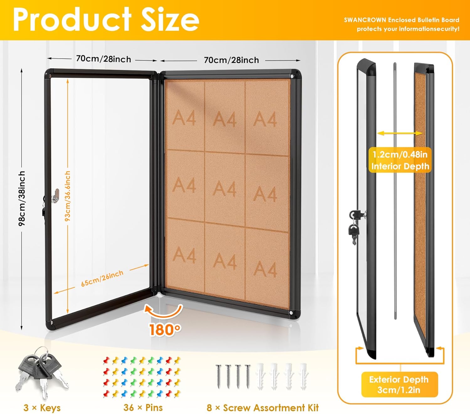 SWANCROWN Enclose Bulletin Board Case School Cork Noticeboards Cabinet with Locking Door and Keys,38x28 inch (9xA4)