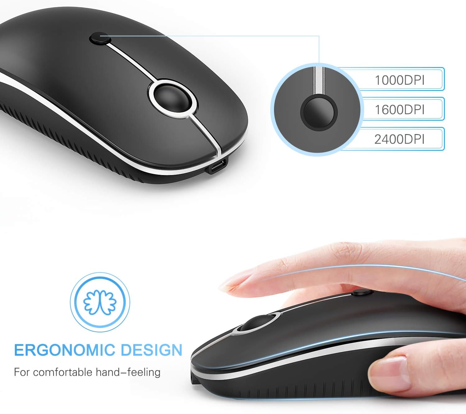 - 【ADJUSTABLE DPI AND ERGONOMIC DESIGN】3 DPI lecvels (1000/1600/2400 DPI) allows you to change the cursor sensitivity easily and track more smoothly over a variety of surfaces. Contoured shape fits your hands perfectly, reducing hand fatigue