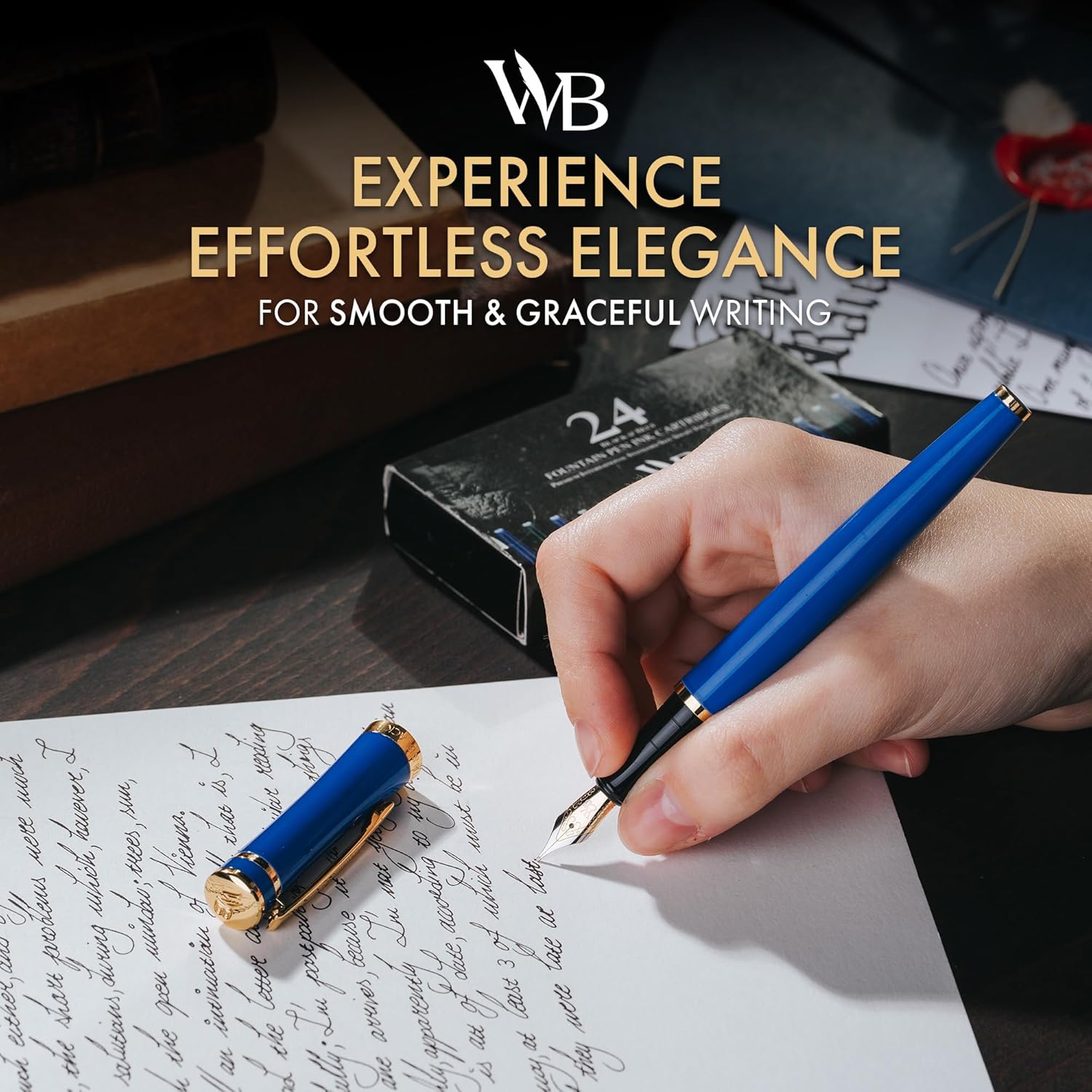 Wordsworth & Black Fountain Pen Set, 18K Gilded Medium Nib, Includes 24 Pack Ink Cartridges, Ink Refill Converter & Gift Box, Gold Finish, Calligraphy, [Imperial Blue], Perfect for Men & Women