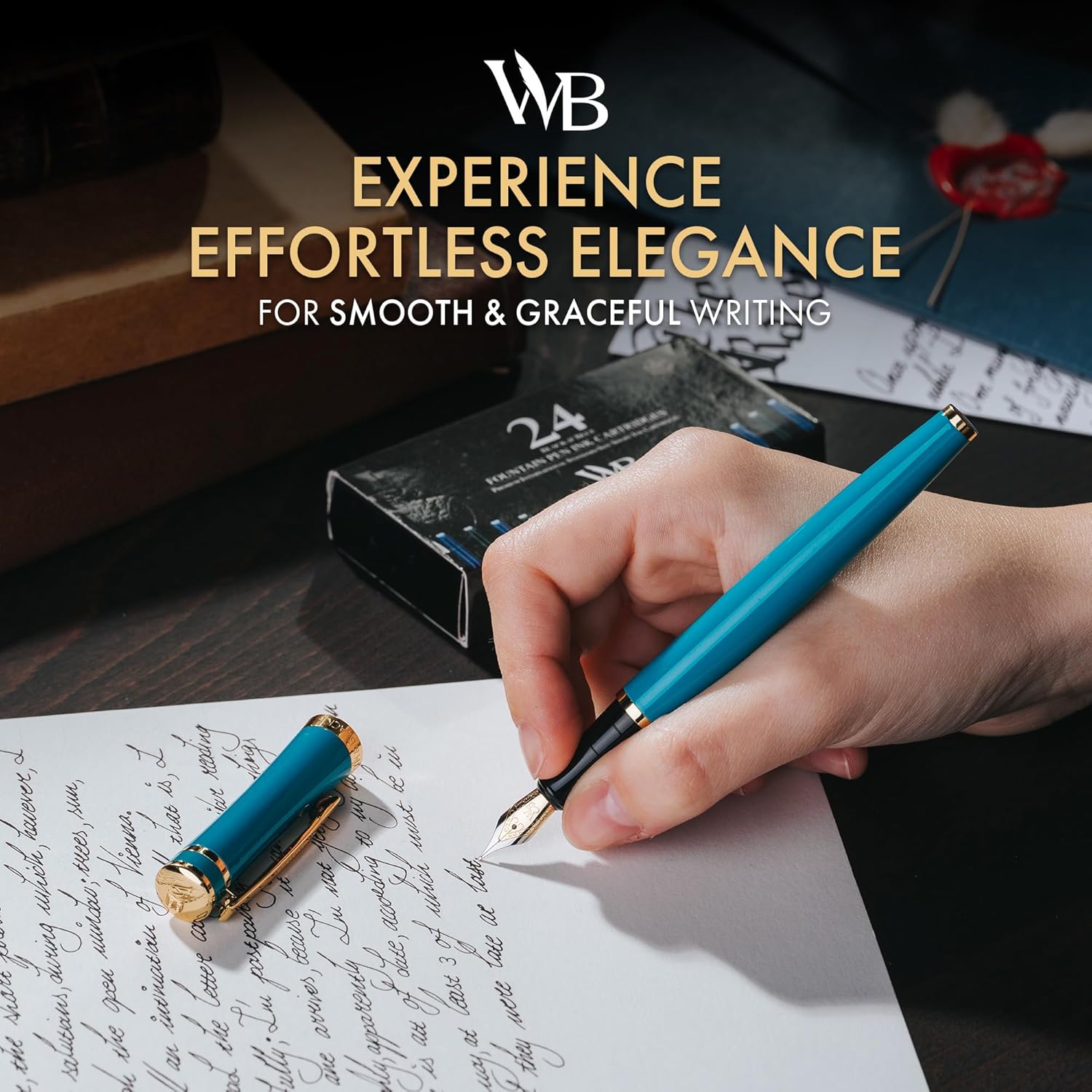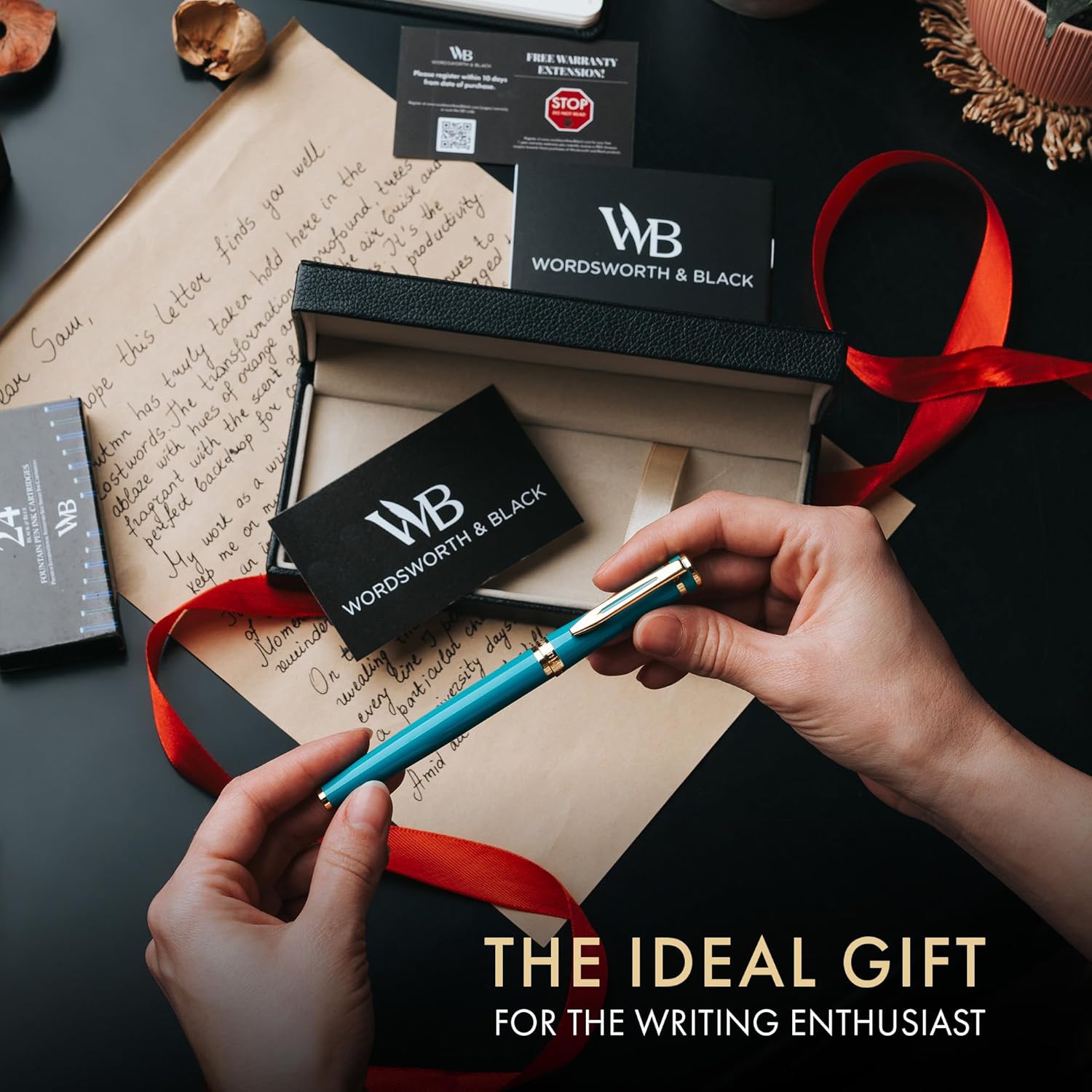 Wordsworth & Black Fountain Pen Set, 18K Gilded Medium Nib, Includes 24 Pack Ink Cartridges, Ink Refill Converter & Gift Box, Gold Finish, Calligraphy, [Turquoise Gold], Perfect for Men & Women
