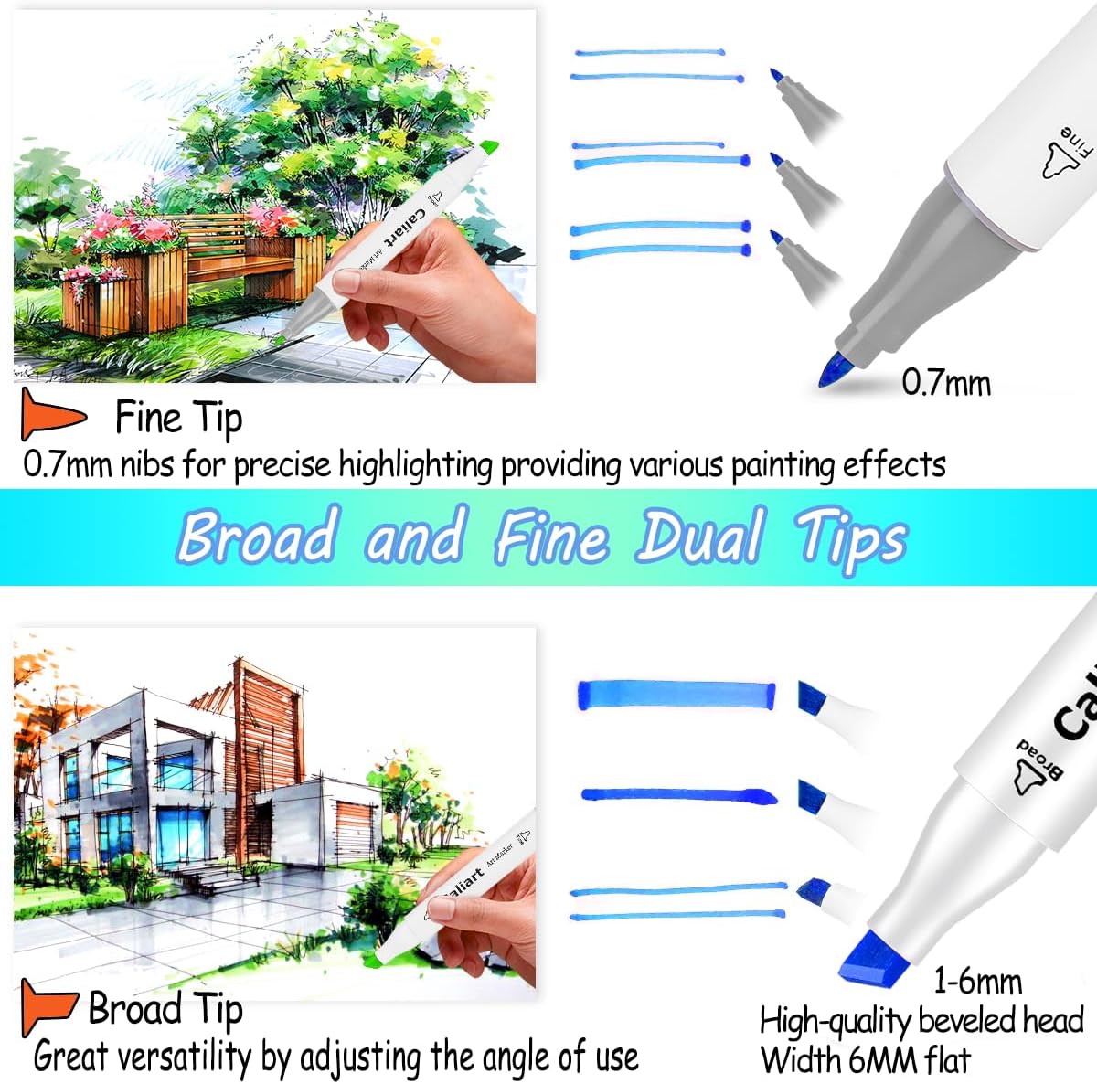 - π¨ Dual Tips & Round Pen Holder - Broad chisel (approx. 1-7mm) and fine point (approx. 0. 7mm) nibs for precise highlighting and underlining. Allowing you to write in both thin and thick lines, providing great versatility. Caliart artist markers are great for providing various styles, sketches and patterns with ease. NOTE: as they are Alcohol Based Markers like ALL other brand alcohol markers, they will Bleed through regular coloring paper, except very thick paper, marker paper.