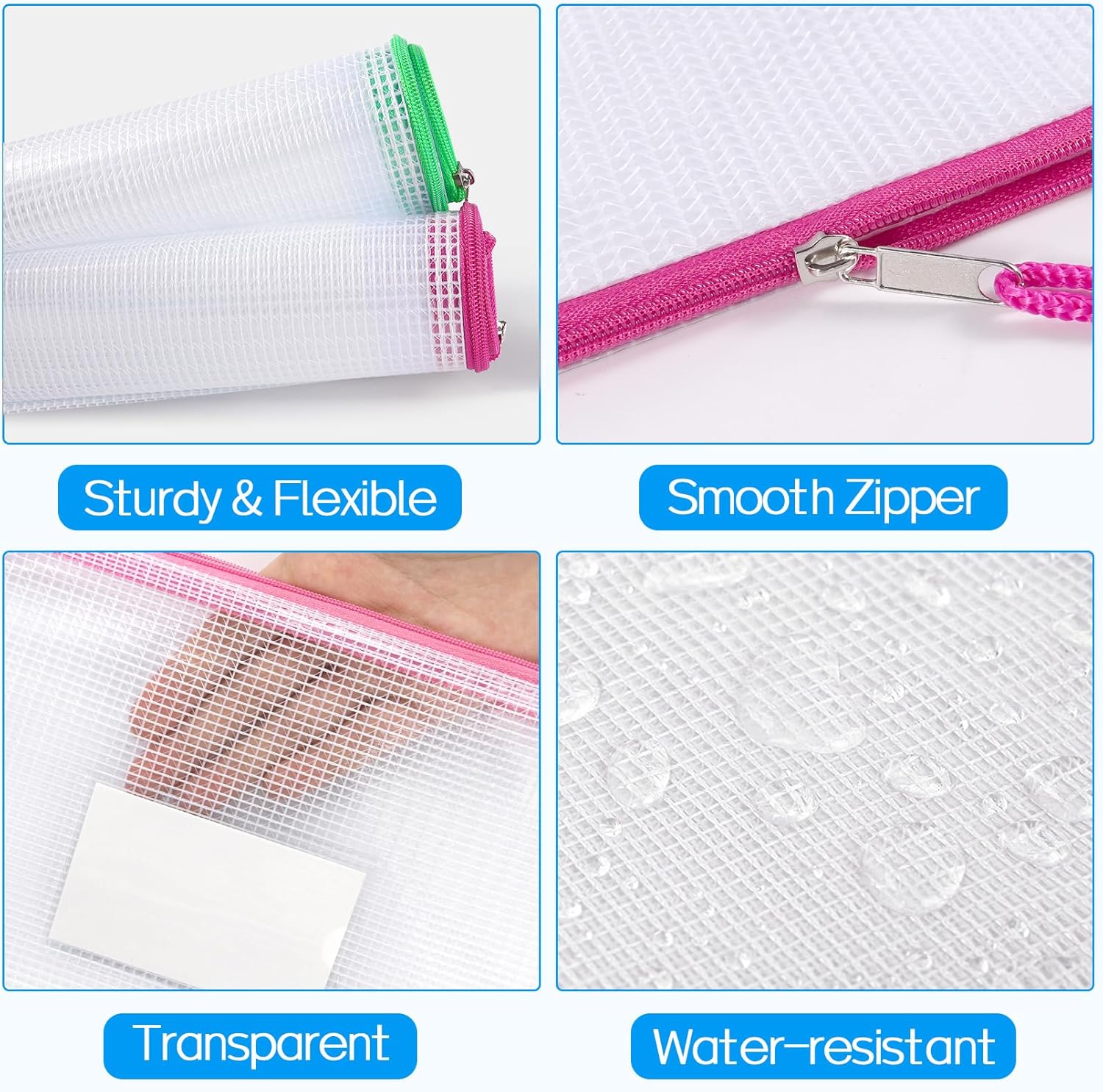Sooez 20 Pack Mesh Zipper Pouch Bags, A4 Letter Size, Zipper Bags with Label Pocket, Waterproof Pouches for Classroom Organization, Board Game Storage, Document Bag for Teacher School Office Supplies