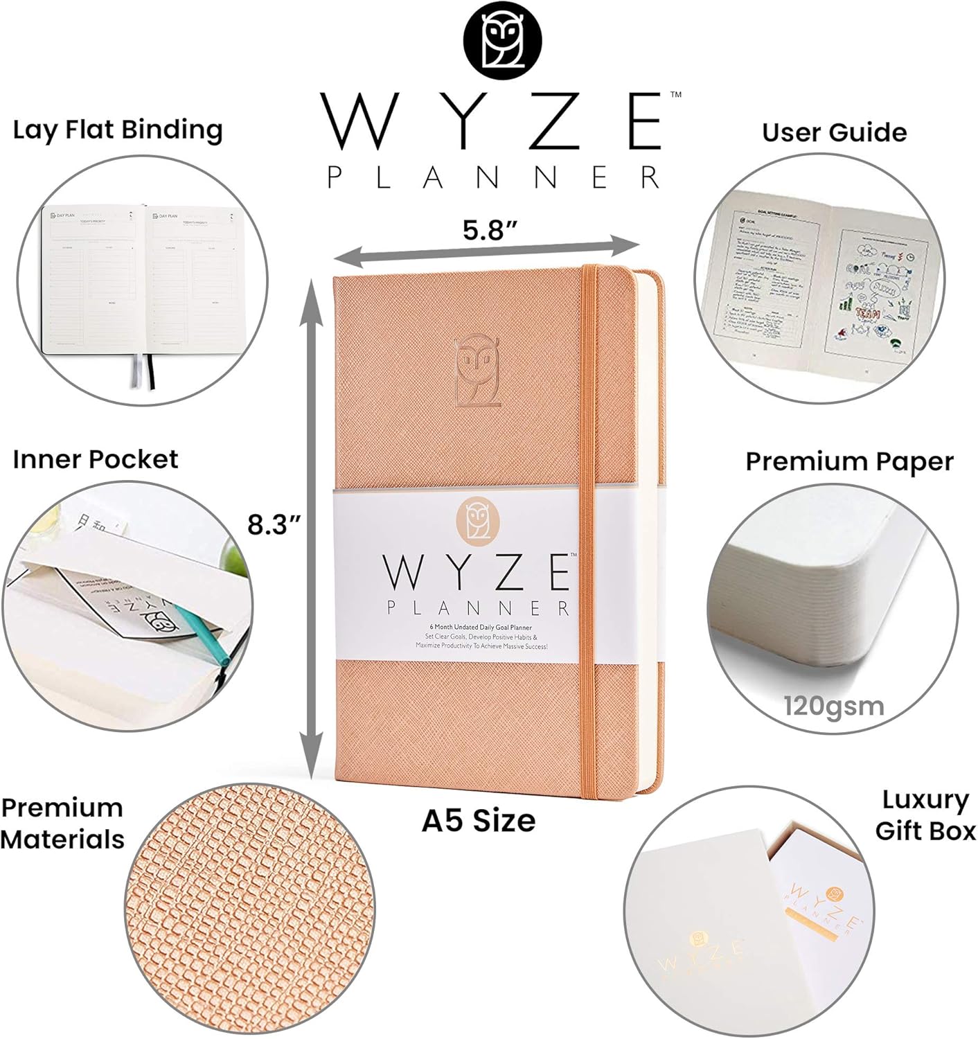 Undated Daily Planner – 6-Month A5 Productivity Organizer with Full Page Per Day, Hourly Schedule, Goal Setting, Habit Tracker, Weekly & Monthly Pages – Hardcover Time Management Notebook (Rose Gold)