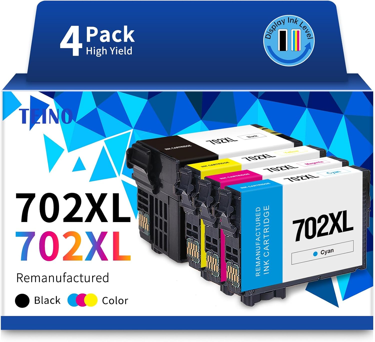 TEINO 702XL Ink Cartridges Combo Pack Remanufactured Ink Cartridge Replacement for Epson 702 XL 702XL T702XL for Epson Workforce Pro WF-3720 WF-3733 WF-3730 Printer (Black Cyan Magenta Yellow, 4-Pack)