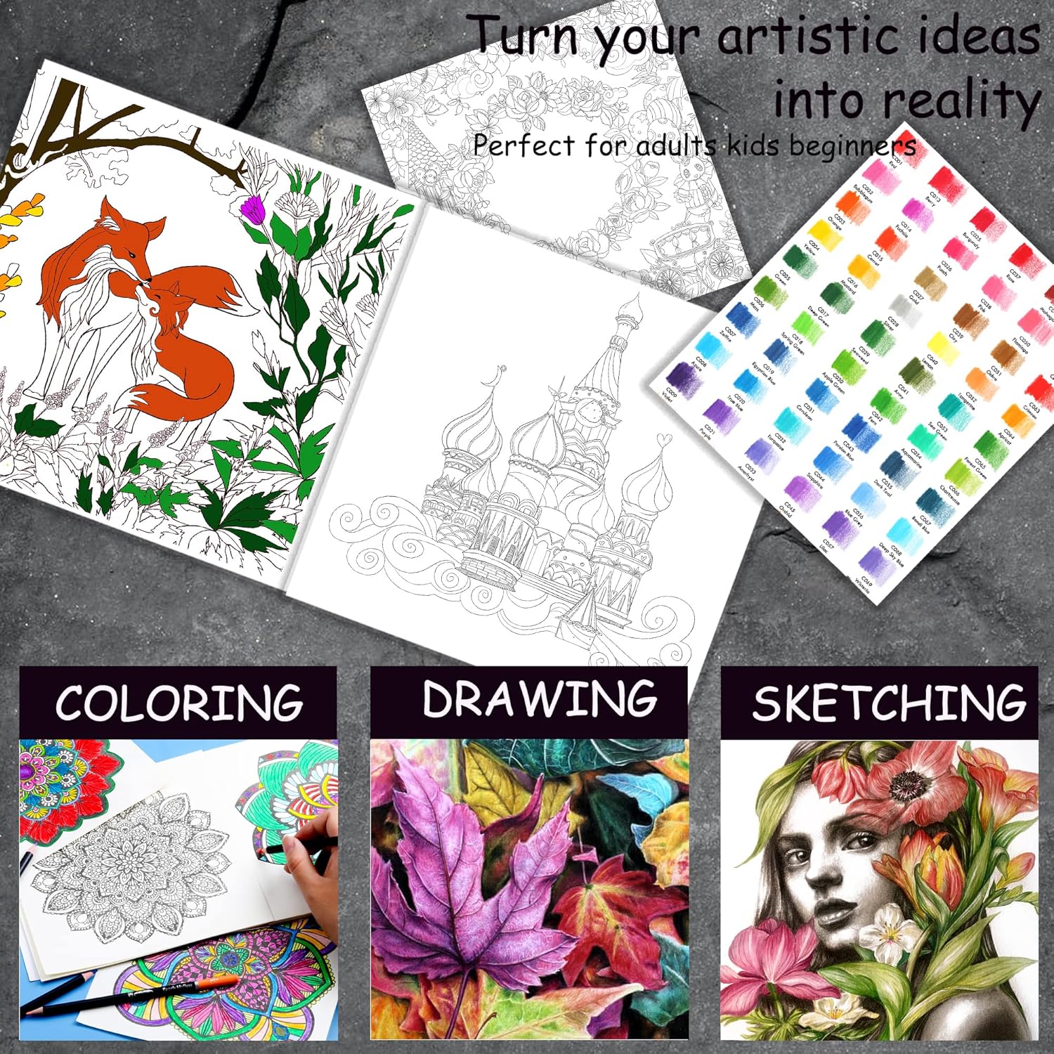 - 96PCS ARTISTS DRAWING SET:Consists of 72 Colored Pencil(with no. On pencil body), 12 Sketching Pencil(5H 4H 3H 2H HB B 2B 3B 4B 5B 6B 8B); 3 Charcoal Pencil(Soft, Medium, Hard), 1 Graphite Pencil(6B), 8 Drawing Accessories(3Blending Stump, 1Metal Sharpener, 1Vinyl Eraser, 1Pencil Extender, 1Sandpaper Block, 1Sketching Pad)