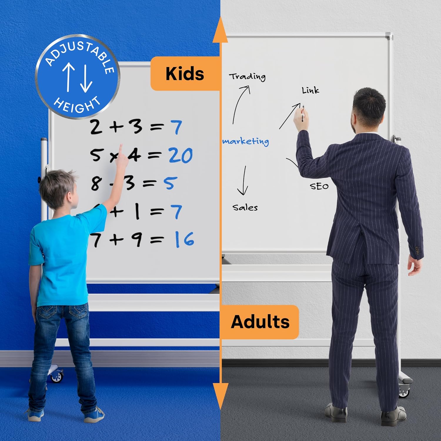 - Easy to Move and Adjust: Our mobile whiteboards feature Swing-Stop wheels and an easel frame that can be locked in place to maximize stability. The double-sided easel stand can easily flip to maximize whiteboard space and the dry erase boards feature magnetic surfaces, which allow you to easily organize accessories.