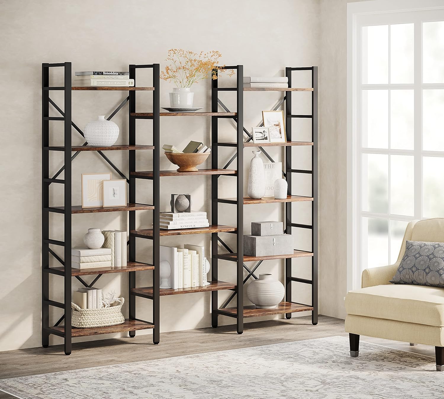Tribesigns Triple Wide 5-Shelf Bookcase, Etagere Large Open Bookshelf Vintage Industrial Style Shelves Wood and Metal bookcases Furniture for Home & Office, 70 inch
