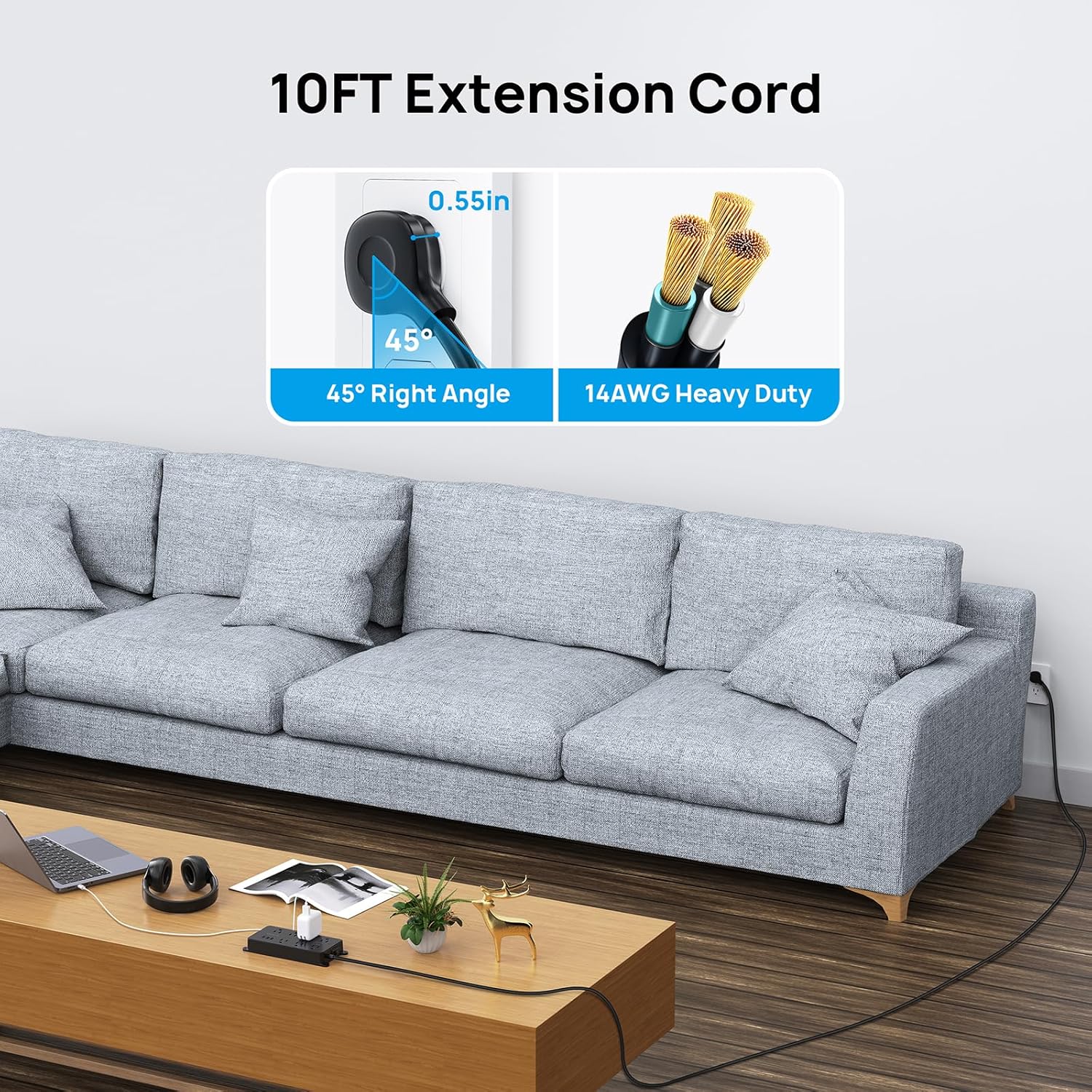- 10ft Extension Cord Flat Plug: This surge protector is made of 14 AWG pure copper for extra durability, the 10ft extension cord is heavy duty and has better current carrying capacity (15a). The low profile right angle flat plug eliminates awkward cords from cluttering and doesnβt block the bottom receptacle