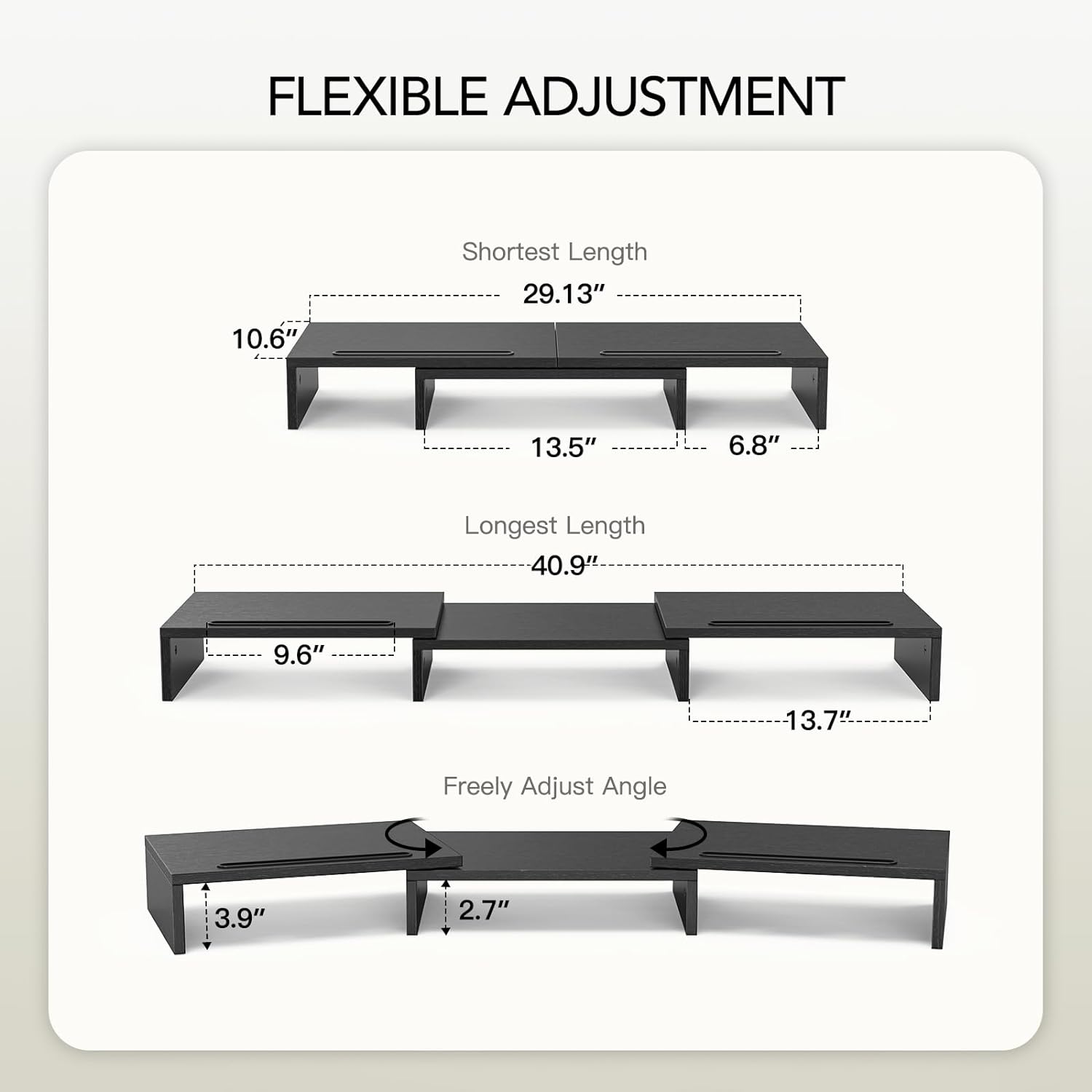 - ADJUSTABLE LENGTH&ANGLE: Freely adjust the angle as you need. The length can be adjusted from the minimum 29.13 inch to the maximum 40.9 inch. This dual monitor riser could help you to form a comfortable sitting position and gain a better viewing experience.