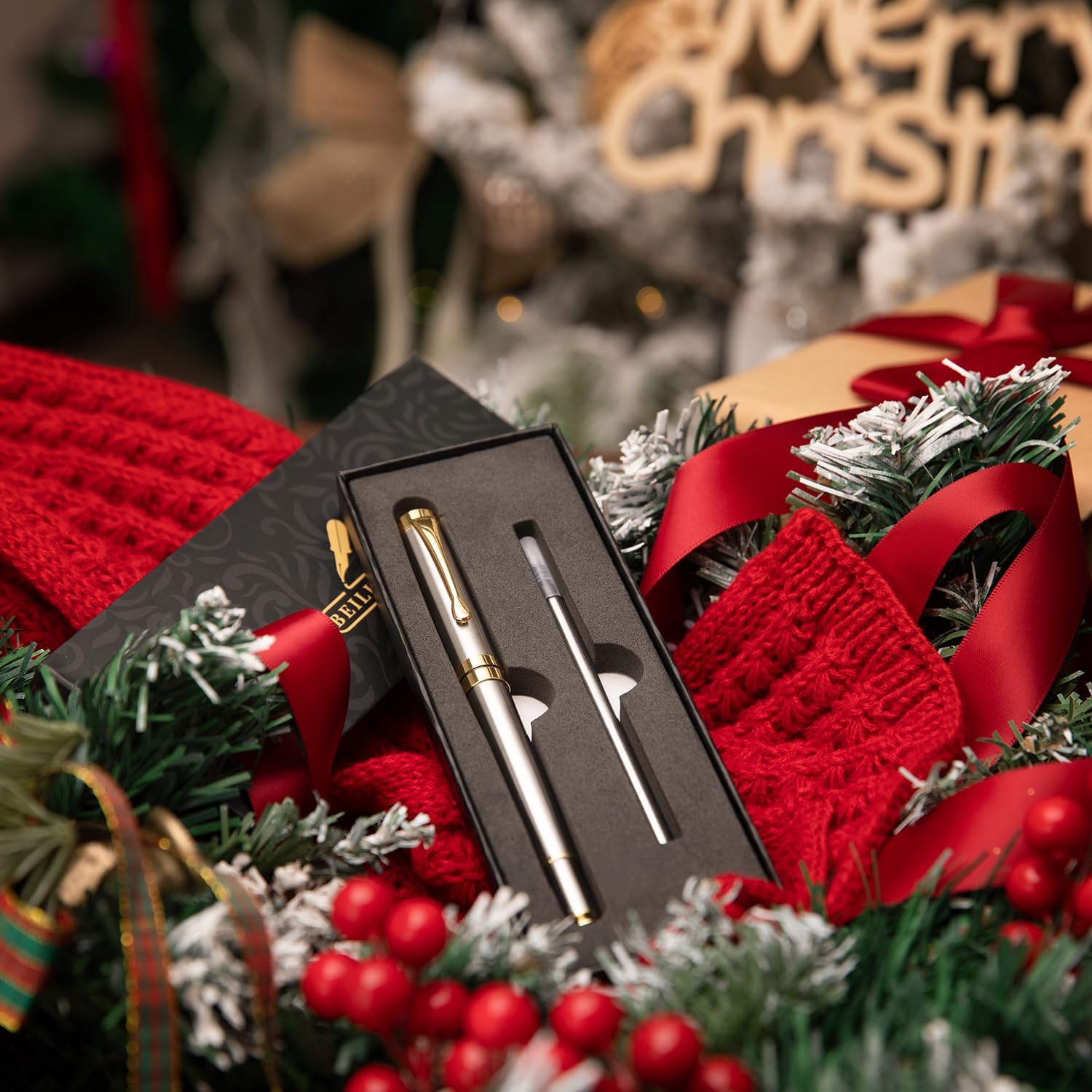 BEILUNER Ballpoint Pens, Stunning Silver Chrome Metal Pen with Golden Trim, Best Ball Pen Gift Set for Men & Women, Professional, Executive, Office, Nice Pens-Gift Box with 0.5mm Extra Black Refill