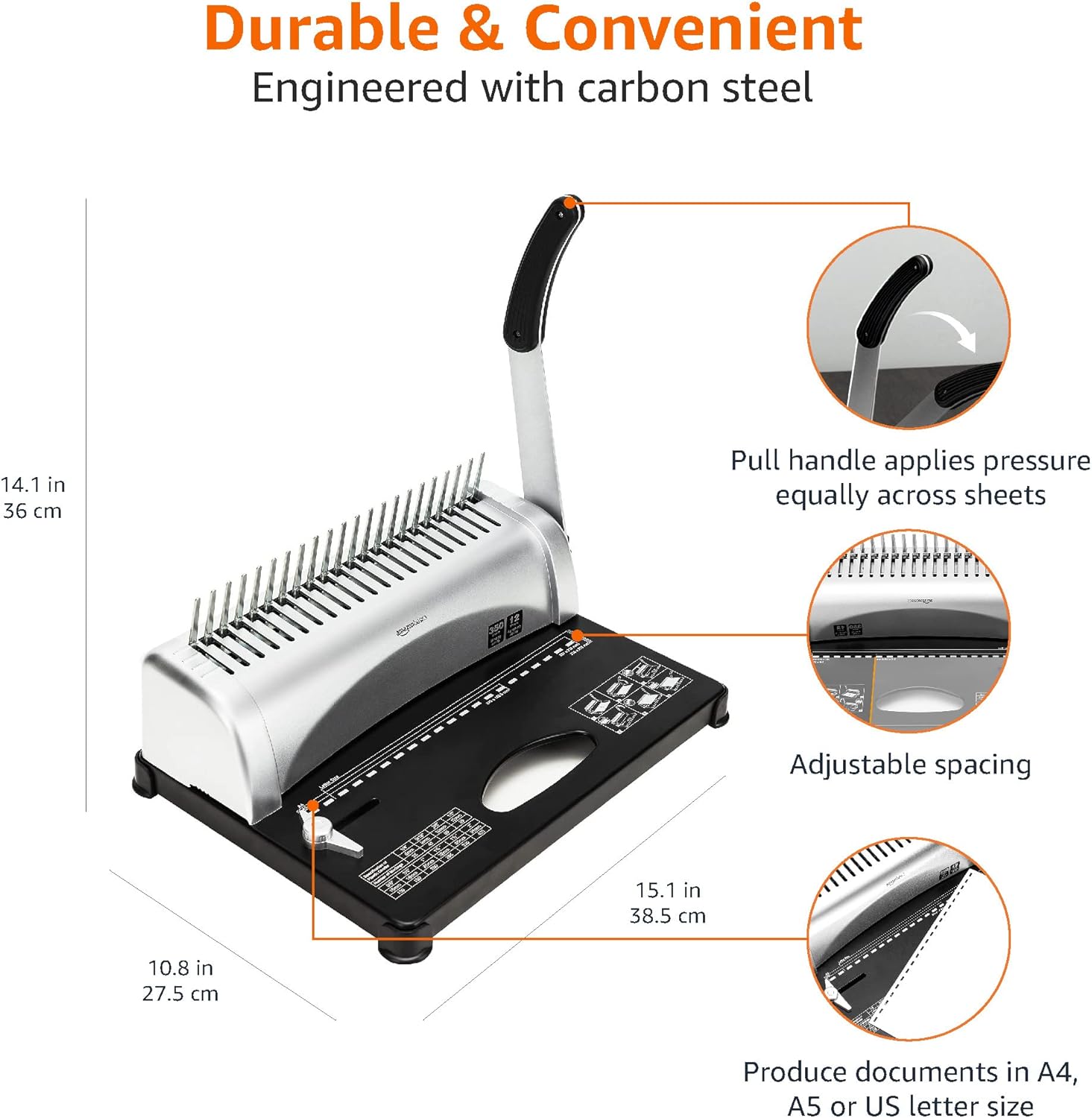 Amazon Basics Comb Binding Machine, 350 Sheets Capacity, for paper sizes A5(15 holes)/Letter(19 holes)/A4(21 holes) with Adjustable Margin, Grey