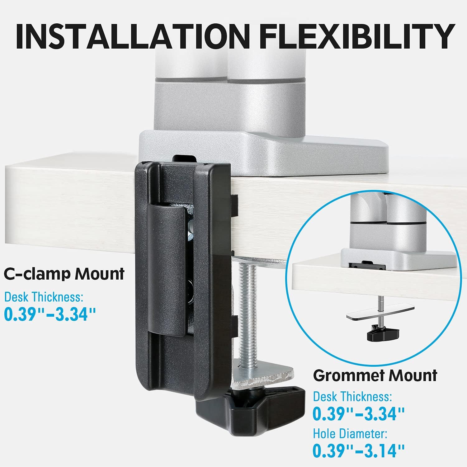 - Upgraded Stability - Unlike ordinary steel products, the double monitor mount is made of high-quality die-cast aluminum, more sturdy and durable. Feature with premium gas spring arm and stable support base, ensure your monitor keeps in security. Suitable for most tables with a thickness of 0.39"-3.34" or a hole diameter of 0.39"-3.14".