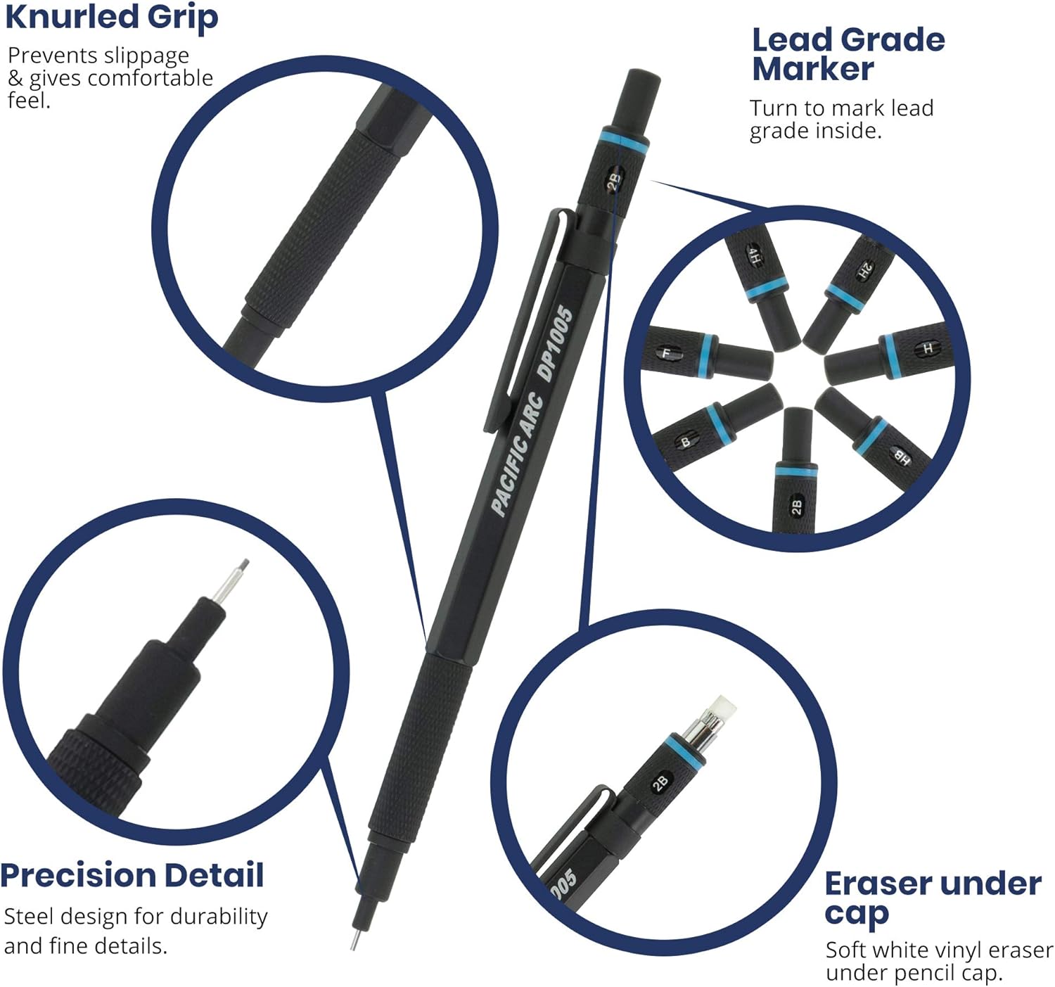Pacific Arc Chromagraph Metal Mechanical Pencil .5 mm Black Barrel Mechanical Pencil with Built In Lead Pencil Grade Indicator, Lead Pencil Holder for Drafting, Sketching, and Drawing
