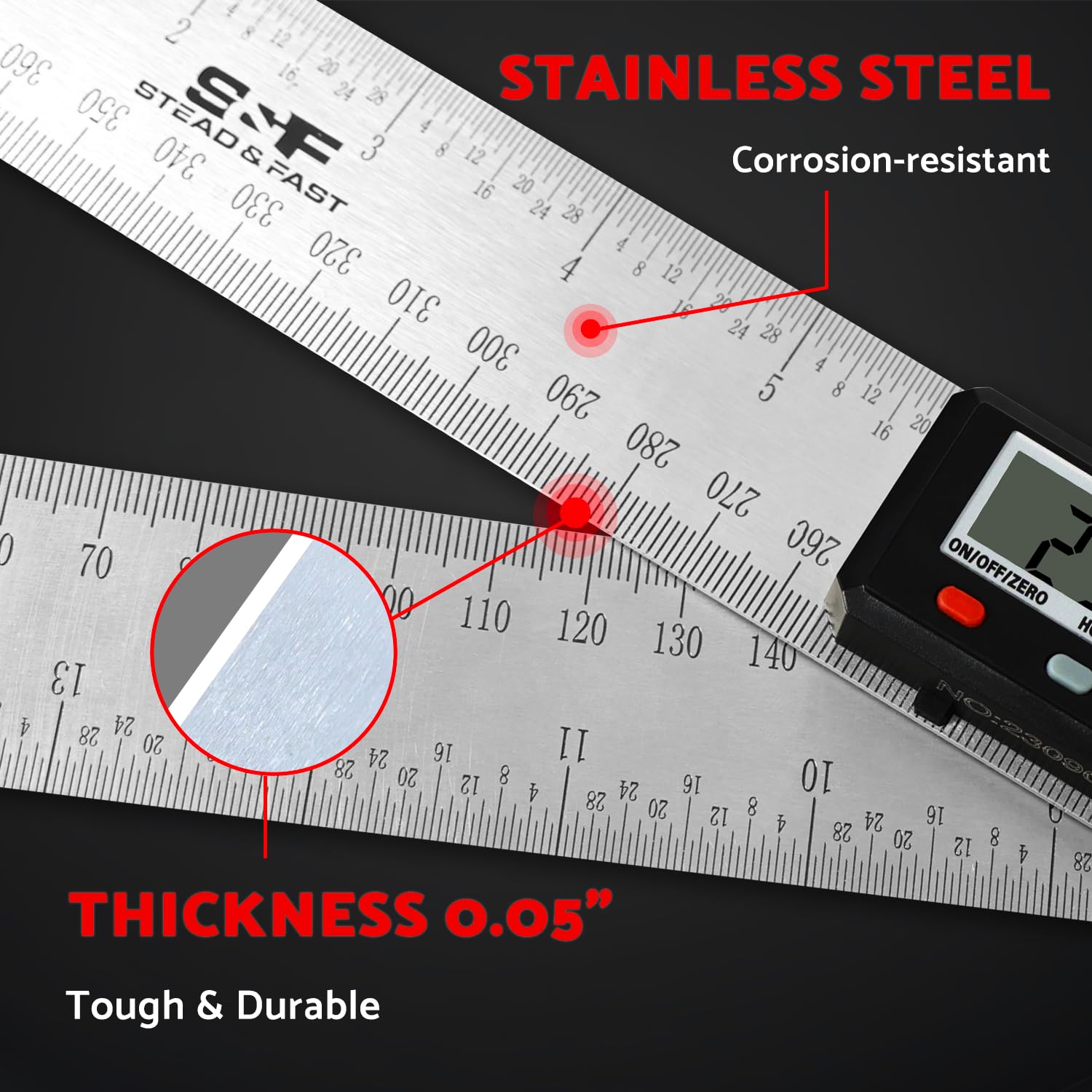 - Durability: Angle finder tool digital made from high tensile strength stainless steel with an etched scale; this ruler withstands frequent use and maintains high precision in harsher environments with corrosion resistance superior to that of aluminum