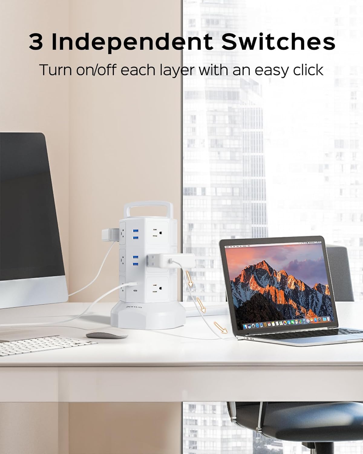 - ▶【Energy Saving and Space Saving】An independent switch is designed on each layer of this power strip with usb ports for you to manage the power of every device you plug in, especially those having on switch on them; efficient in power management with indicator inside switch to check its working status, saving those unnecessary waste of electricity. Besides, the vertical tower design of the power tower helps you save space, and keep your desk neat and tidy.
