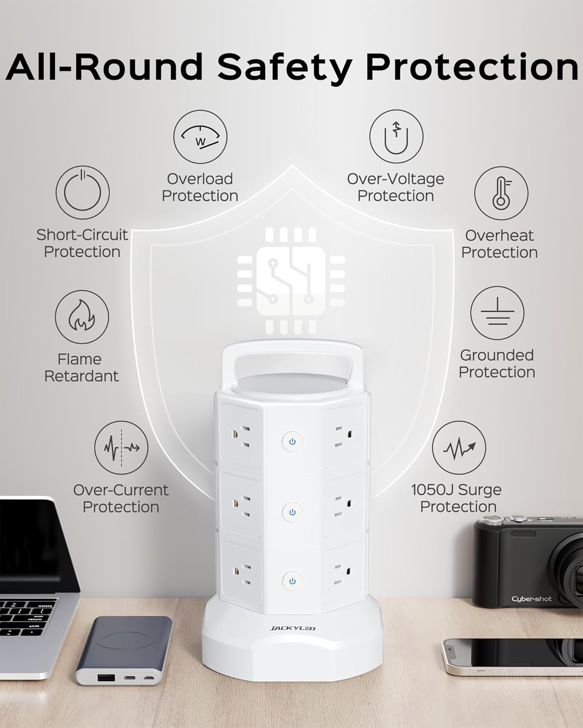- ▶【2 USB-C & 4 USB-A Charging Ports】Tired of searching for adapters when the phone battery is low? With 2 USB-C ports and 4 USB-A ports, JACKYLED USB power strip tower is here to simplify your charging needs. The inbuilt smart charging technology empowers the USBs to intelligently detect your electronic devices and charge them at optimal yet safe speeds—compatible with most USB devices. (Total Output: 4.8A/24W Shared, USB-C: 5V⎓3A, USB-A: 5V⎓2.4A)