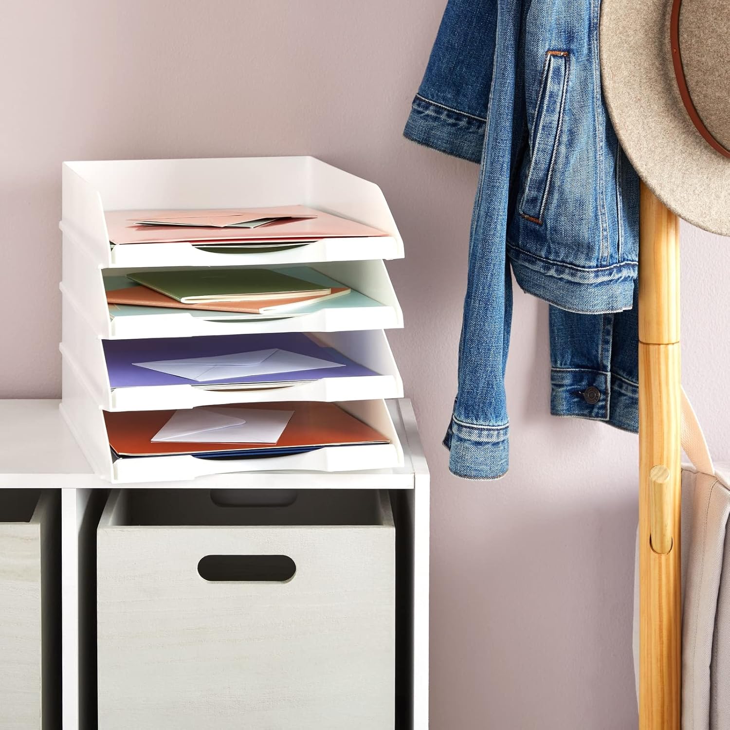 - Comprehensive Package Contents: This set includes 4 white stackable paper trays, enabling you to create a vertical storage unit for letter-sized papers and documents, ideal for effective desk file organization and use as a document holder