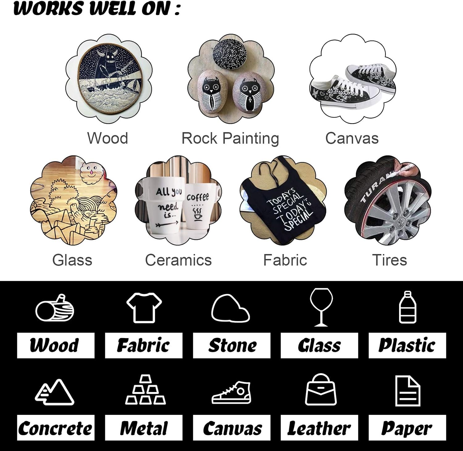 - 【Mark on dark and light color surfaces】Contrast color is very eye-catching, suitable for leave message and sign. Suitable for leave message and permanent sign. Paint markers for rocks painting, fabric, ceramic, glass, wood, plastic, leather, canvas, mugs, blackboard almost any solid surface.