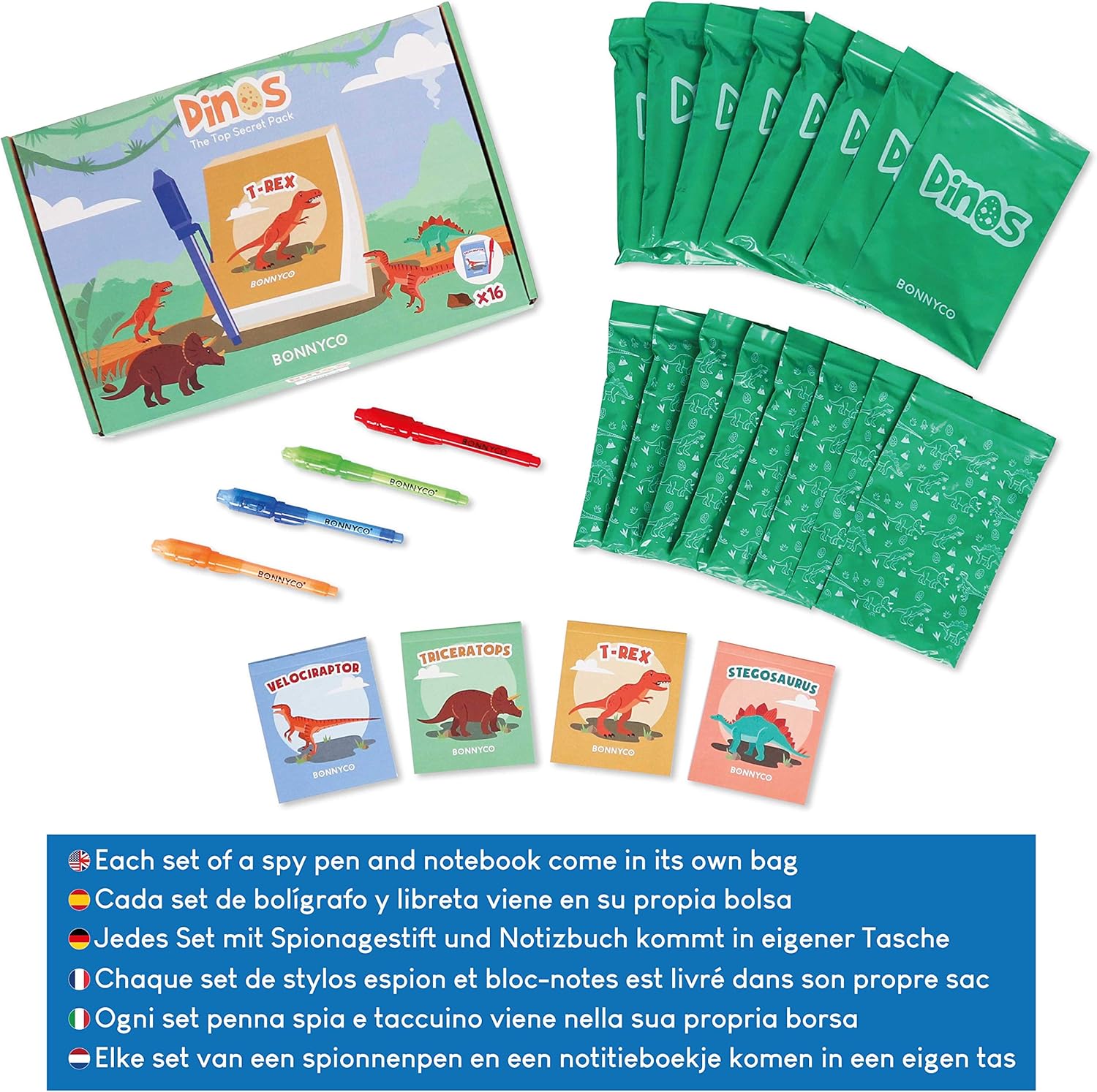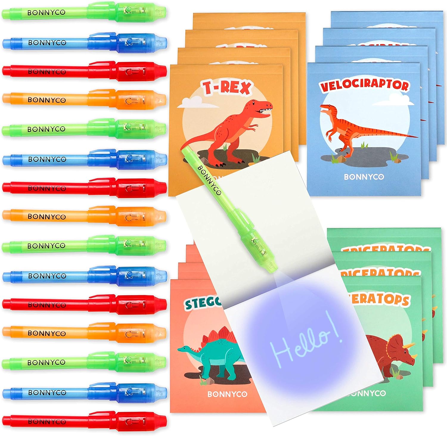 BONNYCO Invisible Ink Pen and Notebook Pack 16 Dinosaur Party Favors for Kids, Magic Spy Pen Goodie Bags Stuffers for Kids, Dinosaur Birthday Party Supplies, Goody Bag Stuffers Return Gifts Prizes
