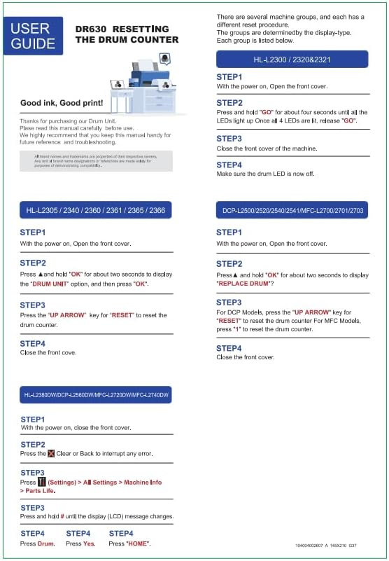 - Note: DR630 DR-630 Drum unit DR630 DR-630 Toner Cartridge Replacement for Brother Printer MUST BE RESET after Installation. For the Detailed Operation Method, Please See our Instruction Included