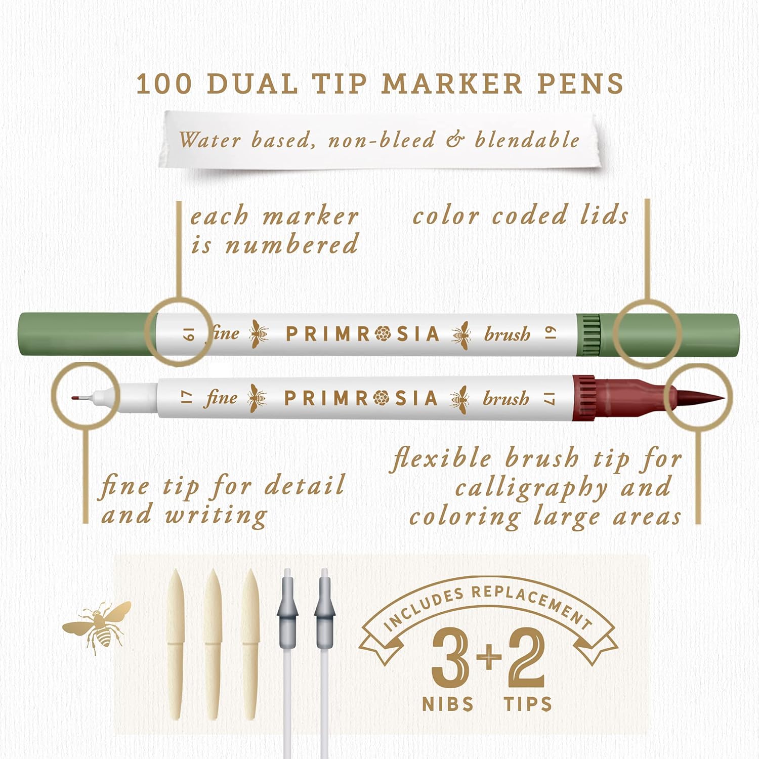 Primrosia 100 Dual Tip Marker Pens, Fineliner and Watercolor Brush Pens for Art Sketching Illustration Calligraphy or Journals Drawing Coloring
