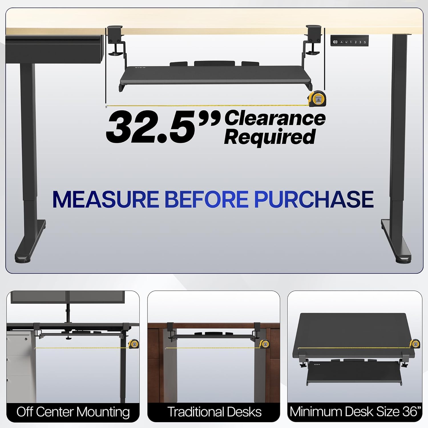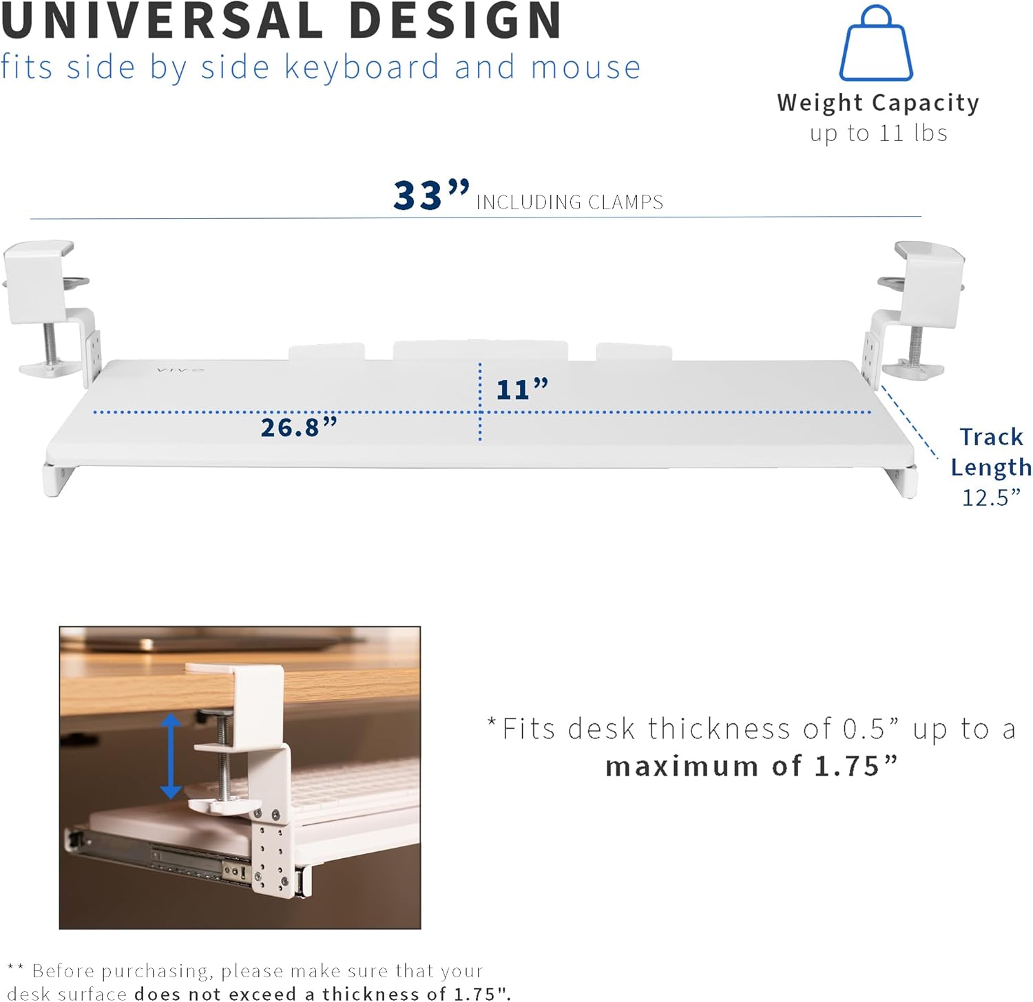 - Compatibility: Before purchasing, please make sure that your desk surface does not exceed a thickness of 3.4". Note the tray's total length from clamp to clamp is 33", so please make sure you have that much space on your desk before purchasing
