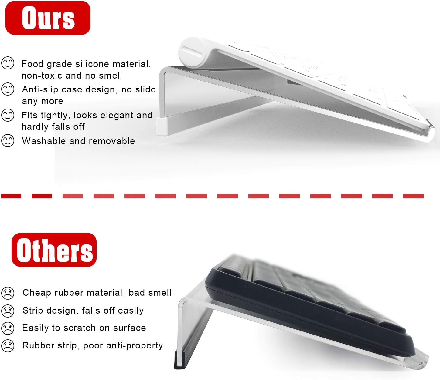 - Non-Slip Silicone Strip - Environmental friendly non-toxic and odorless anti-slip silicone material instead of using cheap rubber strip that fully wraps the light weight small keyboard stand from bottom back protects your desk table from scratching. Safe, sturdy and no slipping. Looks good with black and silver home office decor.