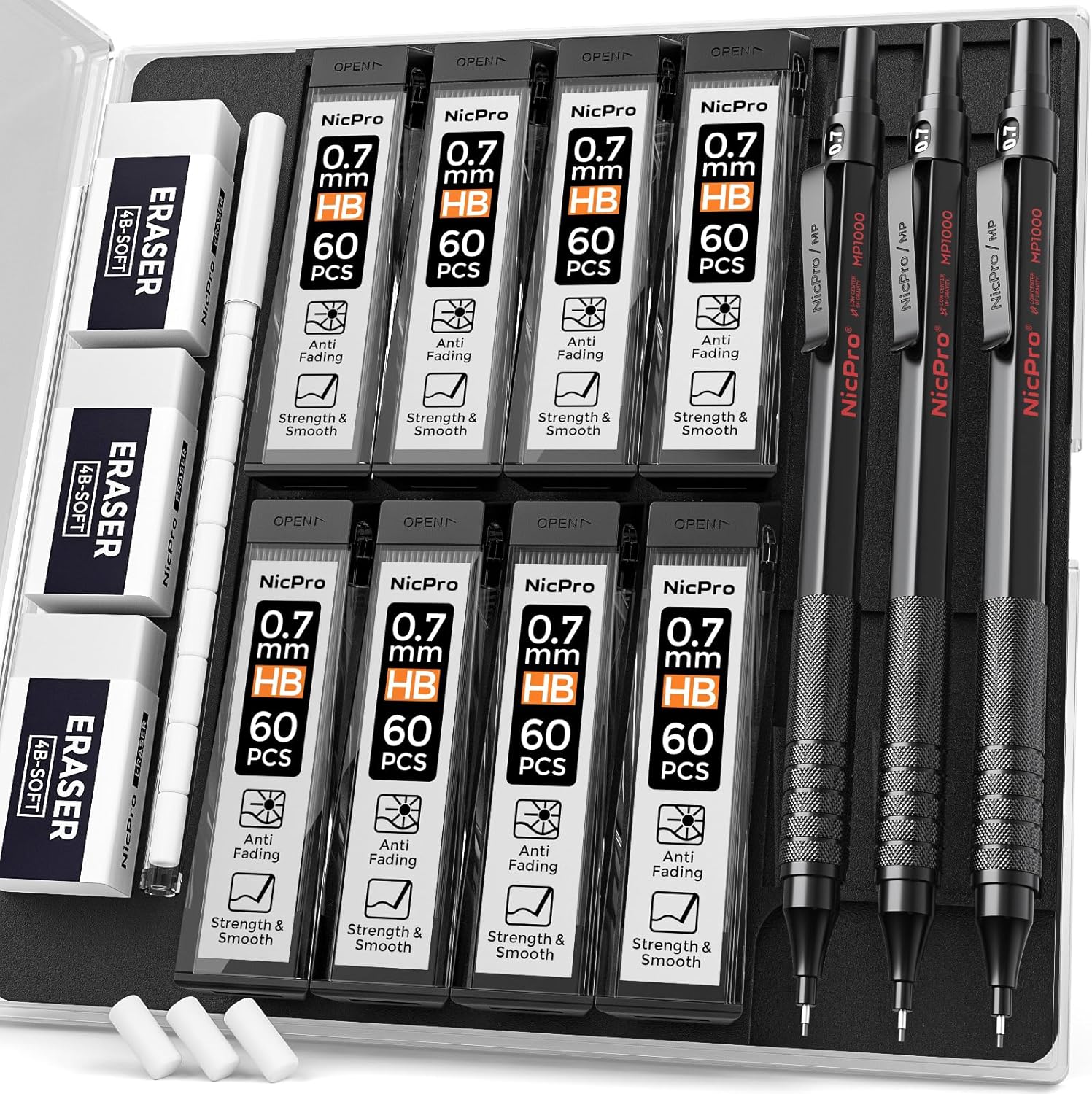 Nicpro 0.7 mm Mechanical Pencil Set with Case, 3 Metal Artist Pencil With 8 Tube HB Lead Refills, 3 Erasers, 9 Eraser Refills For Architect Art Writing Drafting Drawing, Engineering, Sketching, Black