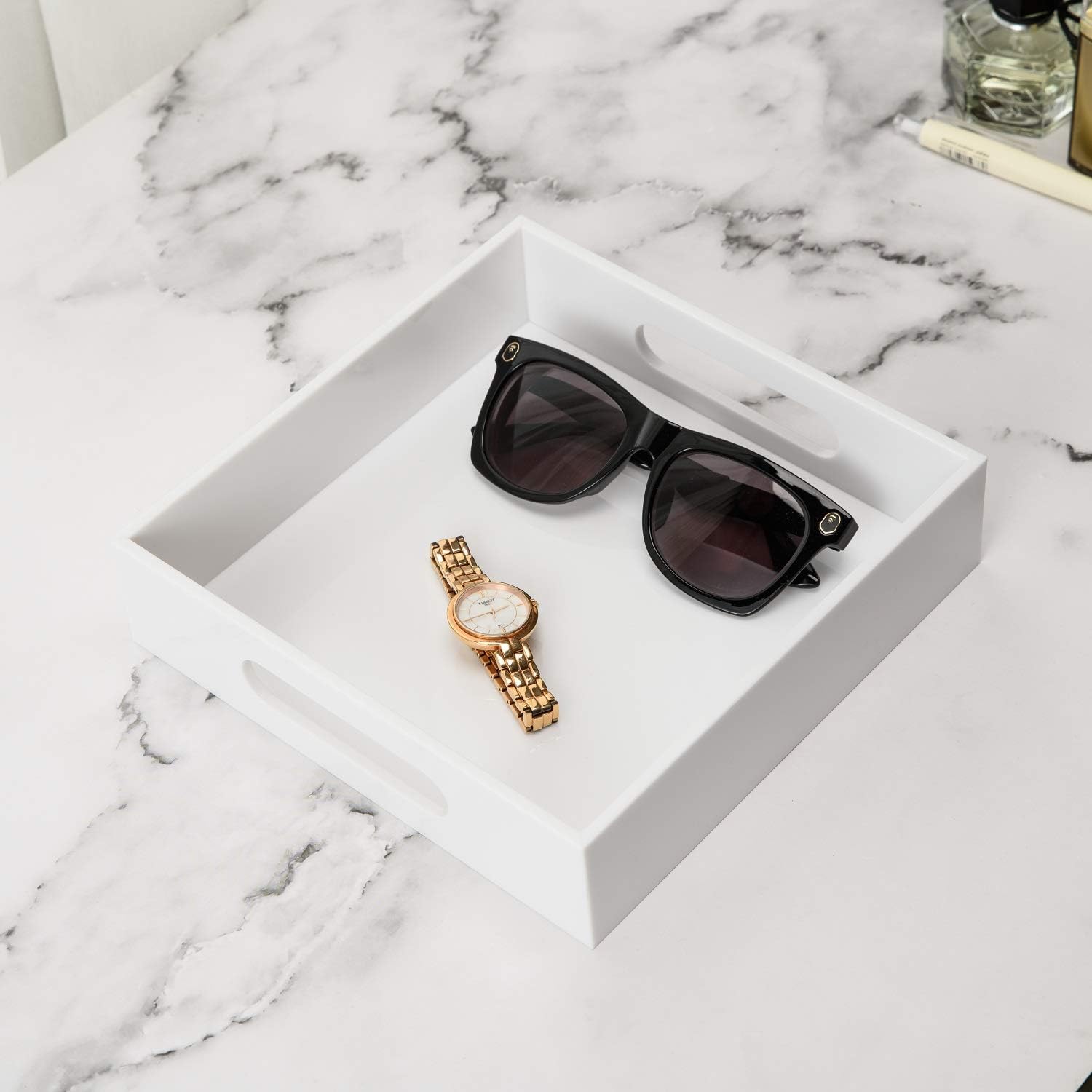 White Sturdy Acrylic Tray with Handles-8x8 Inch- Countertop Organizer Tray for Kitchen,Bathroom,Office- Storage Box for Cosmetics, Jewelry,Toiletries,Toy,Gadgets