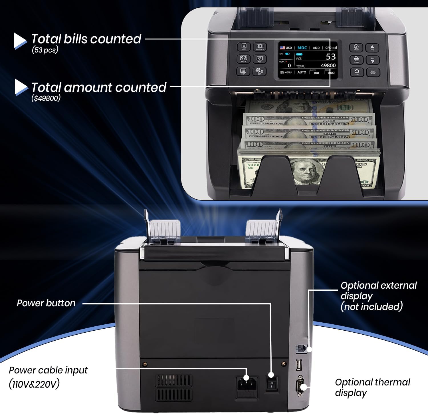 - ✅ [EASY TO USE PROFESSIONAL GRADE HIGH QUALITY WITH A GREAT DESING] The upgraded and enhanced motor with higher speed supports a powerful money counter combined with counterfeit detection for an all-in-one cash processing solution. Counts 1,000 bills per minute with the counterfeit detector activated to make quick work any cash amount. With a Hopper Capacity: 500 bills and Stacker Capacity: 200 bills, 2 years warranty