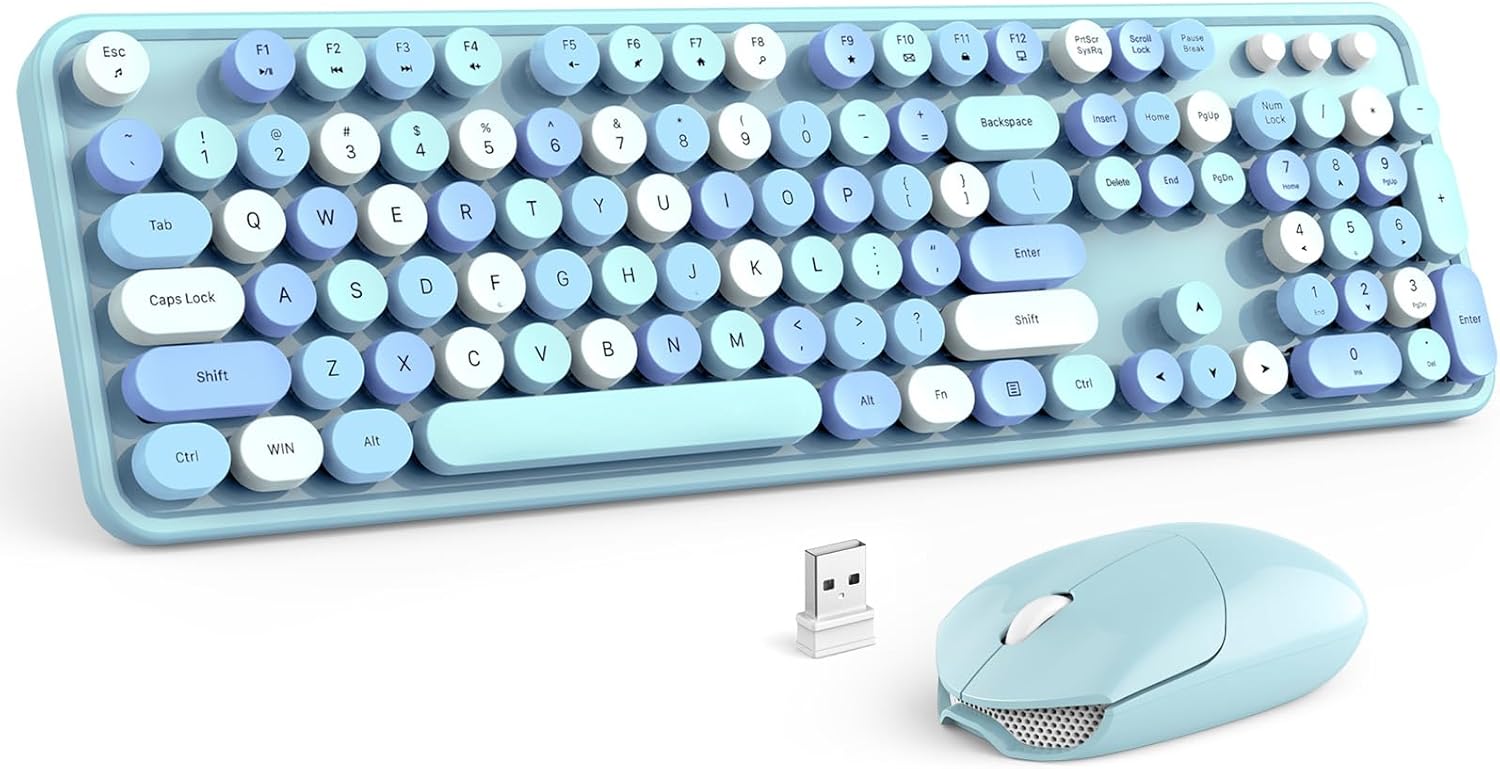 - Wireless Keyboard and Mouse: 104 keys full size colorful keyboard with round keycaps, retro typewriter keyboard style design. Cute wireless mouse with cool sports car shape design. Aesthetic keyboard and mouse set to enjoy the sense of visual beauty and environmental ambience, bring more fun to your work and life.
