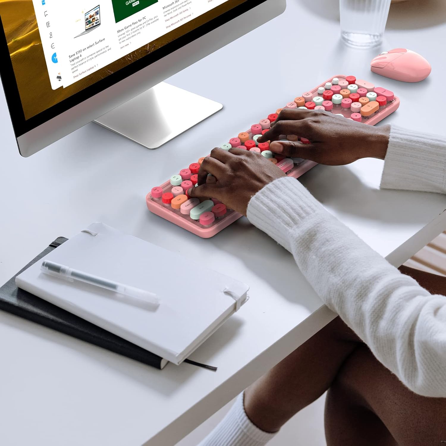 MOFII Wireless Keyboard and Mouse, Pink Colorful Round Key Retro Typewriter Keyboards, USB Wireless 2.4G Full Size Keyboard and Cute Mice Combo for Computer, Laptop, PC, Chromebook, Smart TV