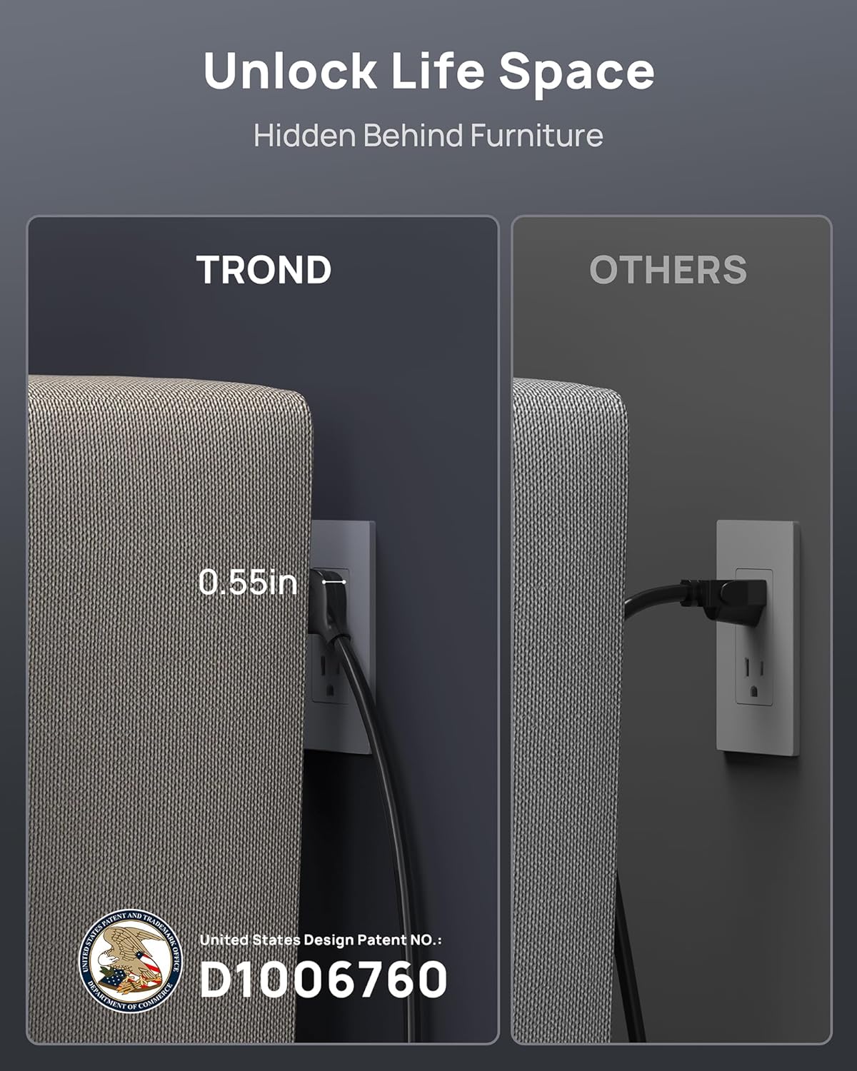 - 10ft extension cord flat plug - Made of 14awg pure copper, the 10-foot long power cord is heavy-duty and has better current carrying capacity (15a). The low-profile space-saving 45° angled flat plug doesn’t block the bottom receptacle