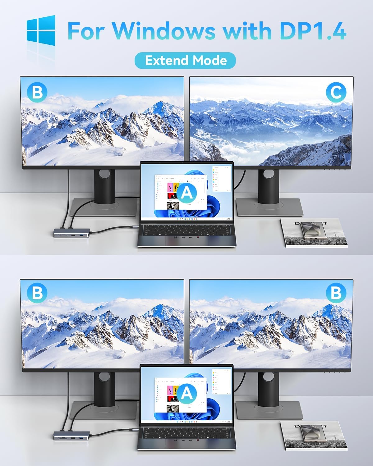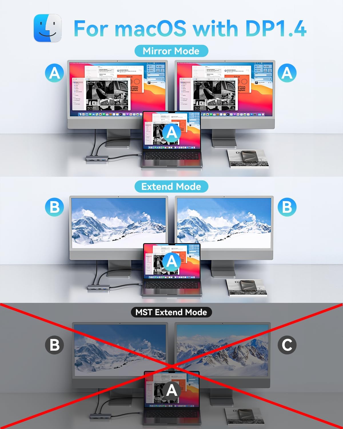 - 【Ultra 4K HDMI】 Outputting in 4K video quality, this usb c to dual hdmi hub maximizes the working efficiency for all visual creators. This usb c hub dual HDMI presents an Ultra-High-Definition video through 1HDMI for 4K 3840*2160@60Hz, 2HDMI for 4K 3840*2160@30Hz. Note: Limited by Apple Mac OS system itself, Mac OS system can only support SST mode, the display of 3 screens will be Laptop(A)+Monitor1(B)+Monitor2(B)