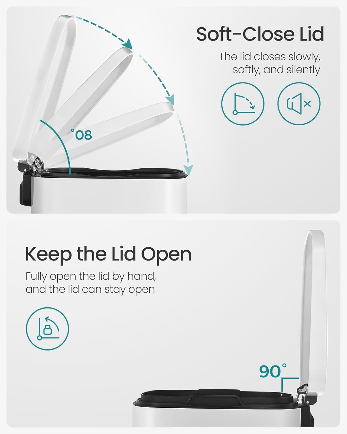 - [Soft Closure] The lid of the garbage can closes slowly, softly, and silently without making a loud clang
