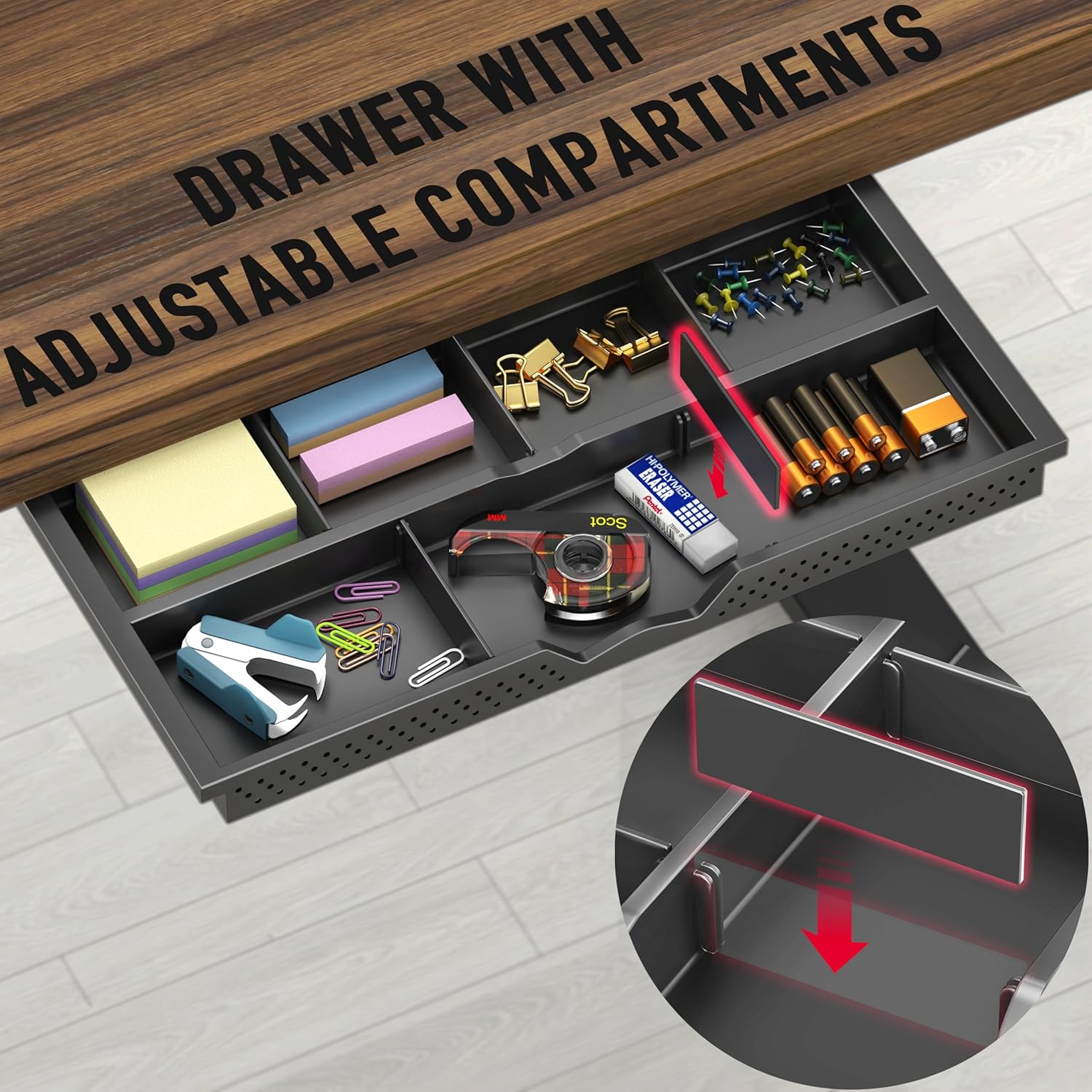 - Integrated Cable Management , Hooks and Drawer: Includes a built-in cable tray to neatly organize cords and reduce desktop clutter, maintaining a clean and professional workspace.