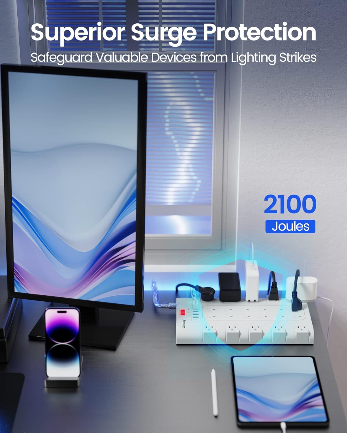 - 【Superior Surge Protection】 Composed of 3 level complementary surge protector circuit, including TVS, MOV, GDT, the surge protector flat plug has a 2100-Joule energy rating providing a reliable power extension cord to protect your devices. It secures your electronic units from power spikes, lightning strikes, or fluctuations.